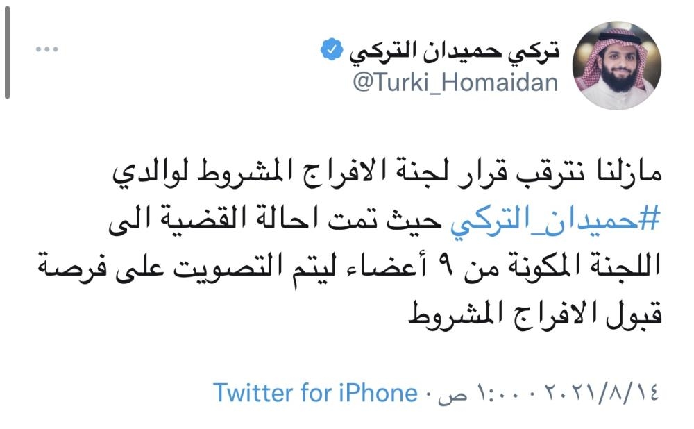 وقال تركي التركي: «ما زلنا نترقب قرار لجنة الإفراج المشروط لوالدي #حميدان_التركي حيث تمت إحالة القضية إلى اللجنة المكونة من 9 أعضاء ليتم التصويت على فرصة قبول الإفراج المشروط».