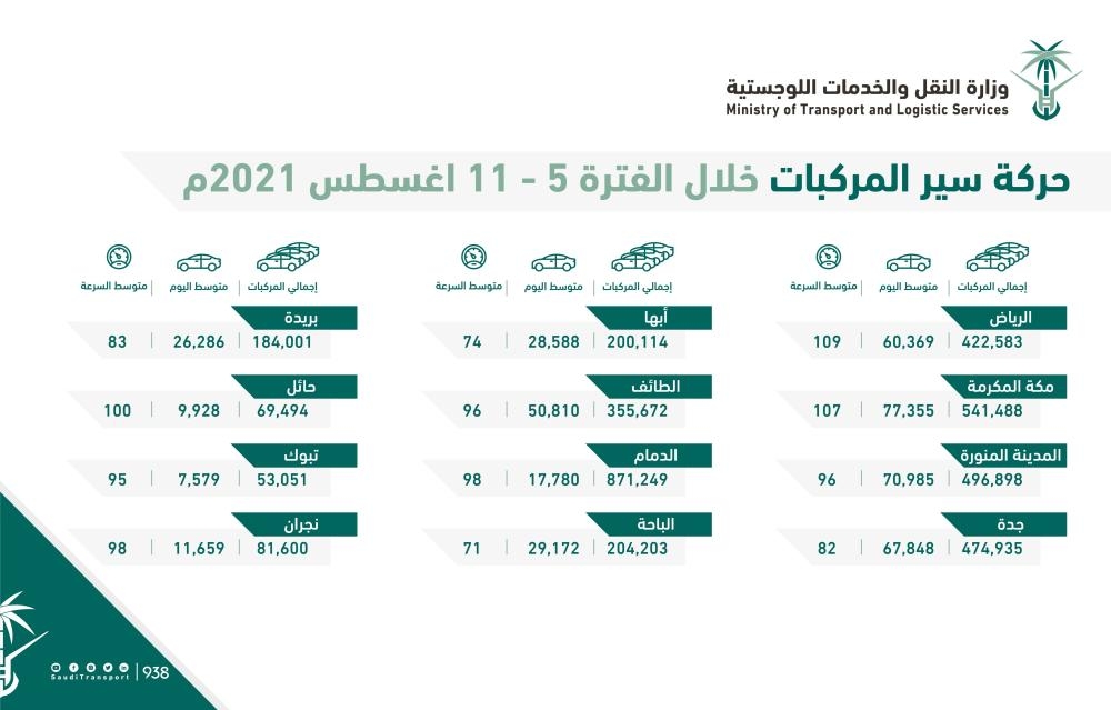 ووفقا للرصد بلغ متوسط حركة السيارات في المدينة نحو 70.985 فيما كان المتوسط في الرياض 60.369 وفي جدة 67.848، في حين كان أعلى متوسط في مكة المكرمة بـ 77.355، بينما سجلت مدينة تبوك أقل متوسط لحركة السيارات بـ 7.579.