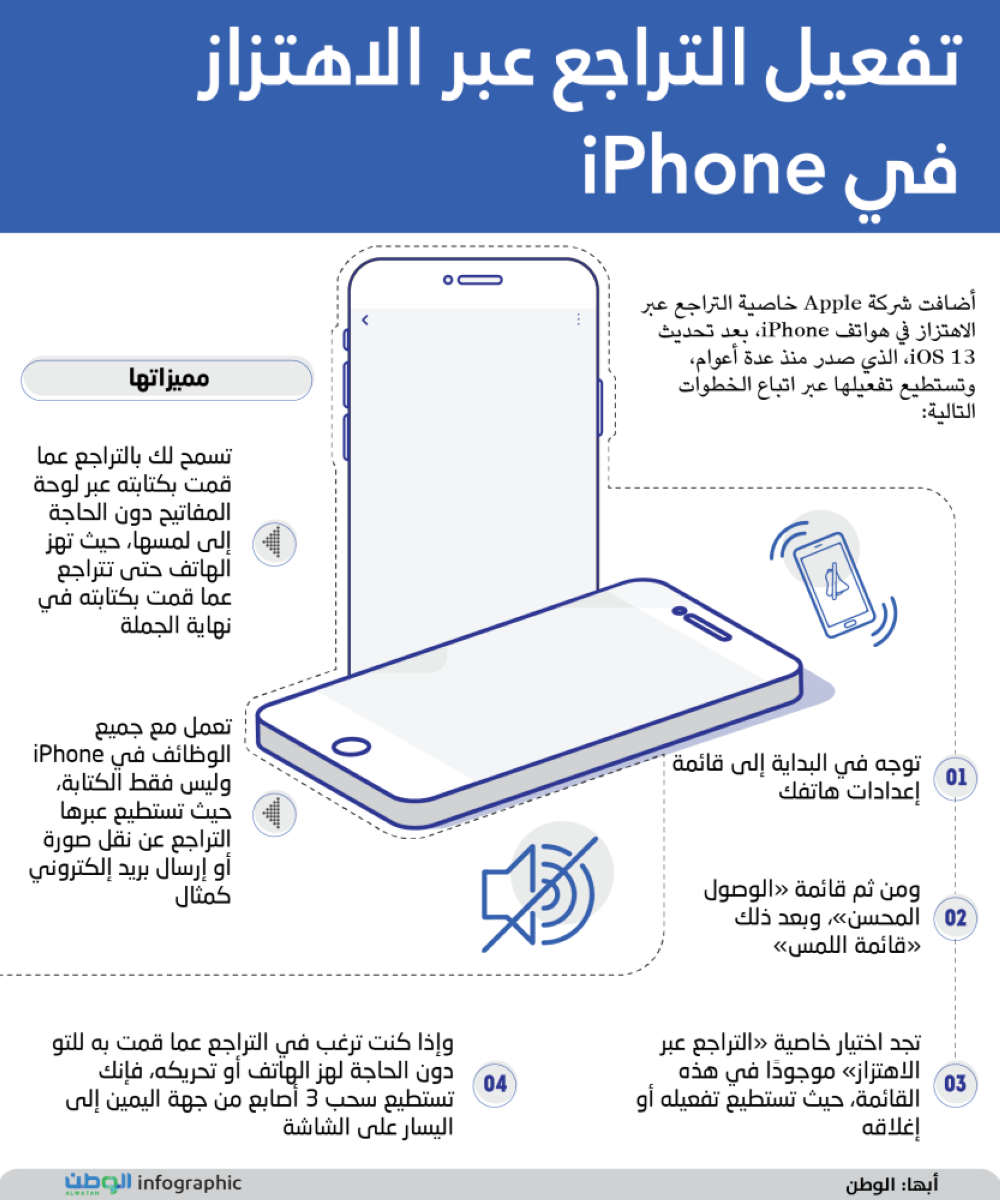 توجه في البداية إلى قائمة إعدادات هاتفك ومن ثم قائمة «الوصول المحسن» وبعد ذلك «قائمة اللمس» تجد اختيار خاصية «التراجع عبر الاهتزاز» موجودًا في هذه القائمة، حيث تستطيع تفعيله أو إغلاقه. وإذا كنت ترغب في التراجع عما قمت به للتو دون الحاجة لهز الهاتف أو تحريكه، فإنك تستطيع سحب 3 أصابع من جهة اليمين إلى اليسار على الشاشة.