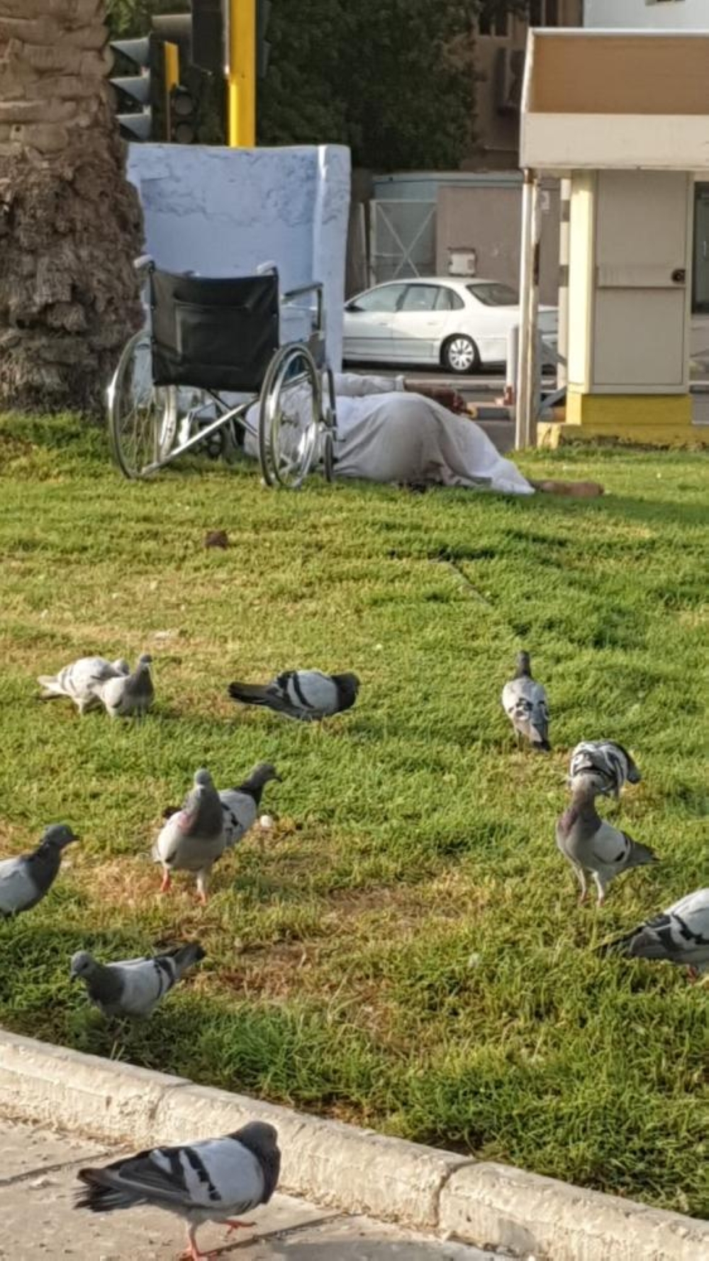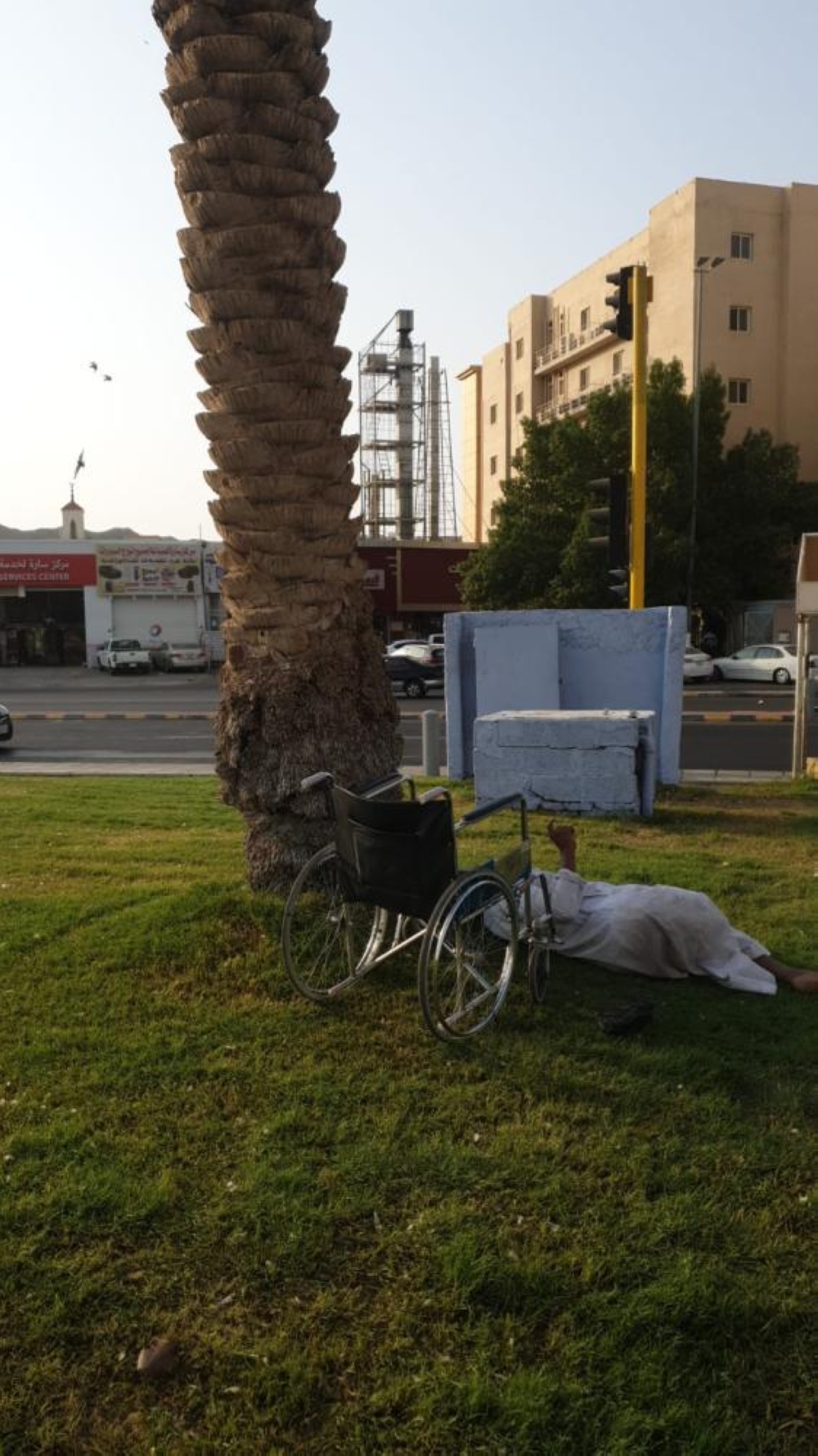 وأضاف أن المشرد، ظل ملازماً للموقع لأكثر من 8 سنوات، ومصاب بداء السكري، والذي جعله مصابًا بالغرغرينا بإحدى قدميه، مما أدى إلى بترها قبل سنة ونصف، مبينا على الصعيد ذاته أن الشخص يلجأ خلال فترة النهار إلى المواقع القريبة، من موقع الإشارة المرورية بعربته المتحركة، وخلال فترة الليل يعود للموقع، وهو الأمر الذي مازال يعمل عليه طيلة تلك السنوات.