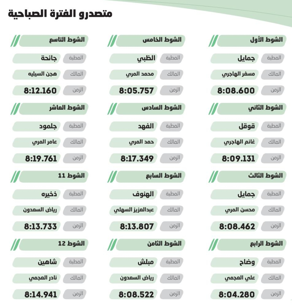 سجل القعود «وضاح» لمالكه علي العجمي أفضل توقيت وصول، بتسجيله زمنًا قدره 280.8:04 دقيقة، وفوزه بنوماس الشوط الرابع.