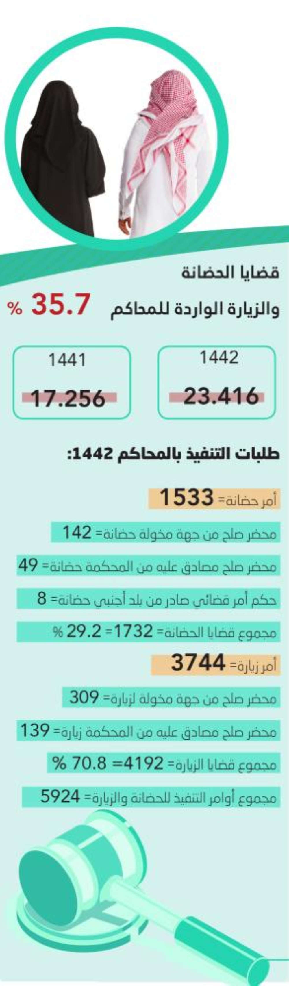 مشيرا إلى أن المحاكم أصدرت 1533 حكم حضانة، و142 محضر صلح لحضانة، و49 محضر صلح مصادقا عليه لحضانة، و8 أحكام لتنفيذ أوامر قضائية صادرة من بلد أجنبي، بالإضافة لإصدار 3744 حكم زيارة، و309 محاضر صلح لزيارة، و139 محضر صلح مصادقا عليه من المحكمة للزيارة.