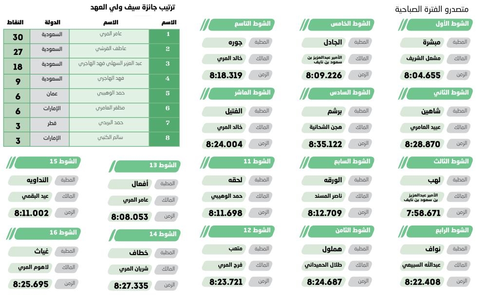سجلت الزمول «لهب» لمالكه الأمير عبدالعزيز بن سعود بن نايف أفضل توقيت وصول، بتسجيل زمن قدره 7:58.671 دقائق، والفوز بالشوط الثالث للفترة الصباحية أمس، في سباق حيل - زمول الذي شهد 16 شوطا. وفي الفترة المسائية استكملت أشواط السباق، وشهدت منافسة قوية بين الهجن المشاركة في السباق.