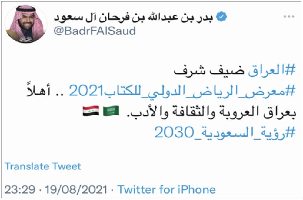 وقال وزير الثقافة: «إن اختيار العراق يأتي في سياق العلاقات الأخوية التي تجمع الشعبين الشقيقين السعودي والعراقي، وفي إطار الجهود المشتركة من البلدين لتعزيز التعاون في جميع المجالات التنموية، ومنها المجال الثقافي»، منوهاً بالثقافة العراقية وعمقها وتنوعها وهو ما سيُثري فعاليات معرض الرياض الدولي للكتاب في دورته المقبلة، حيث سيسهم اختيار العراق ضيف شرف المعرض في خلق مساحة تفاعلية كبيرة بين الجمهور السعودي وبين المثقفين العراقيين وإنتاجاتهم الفكرية والإبداعية.