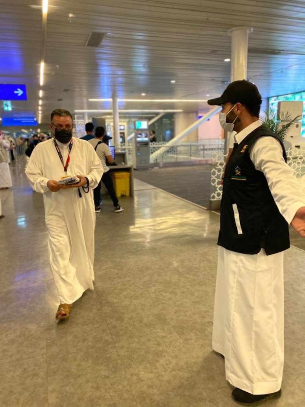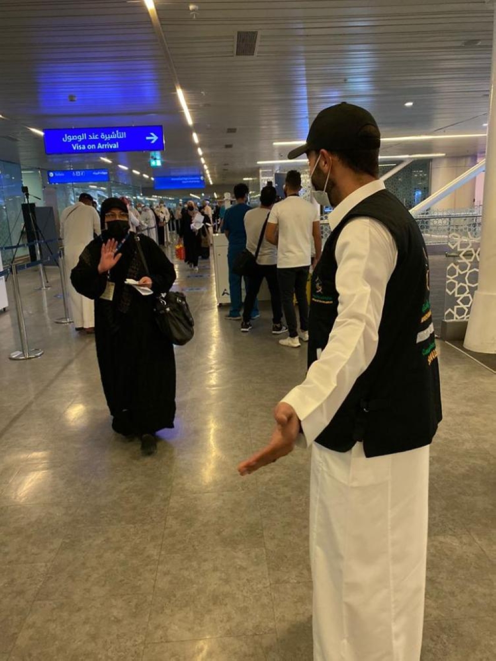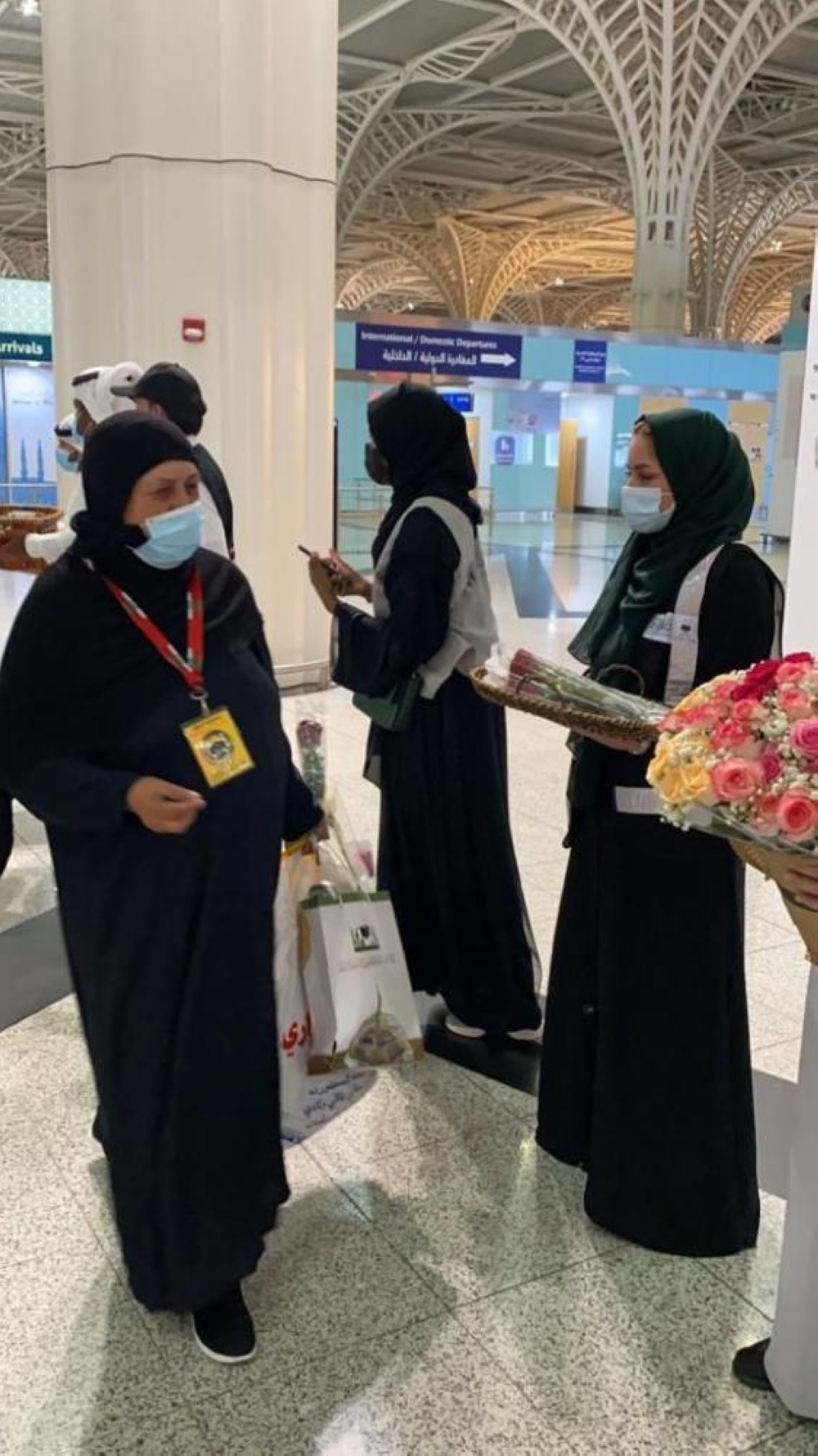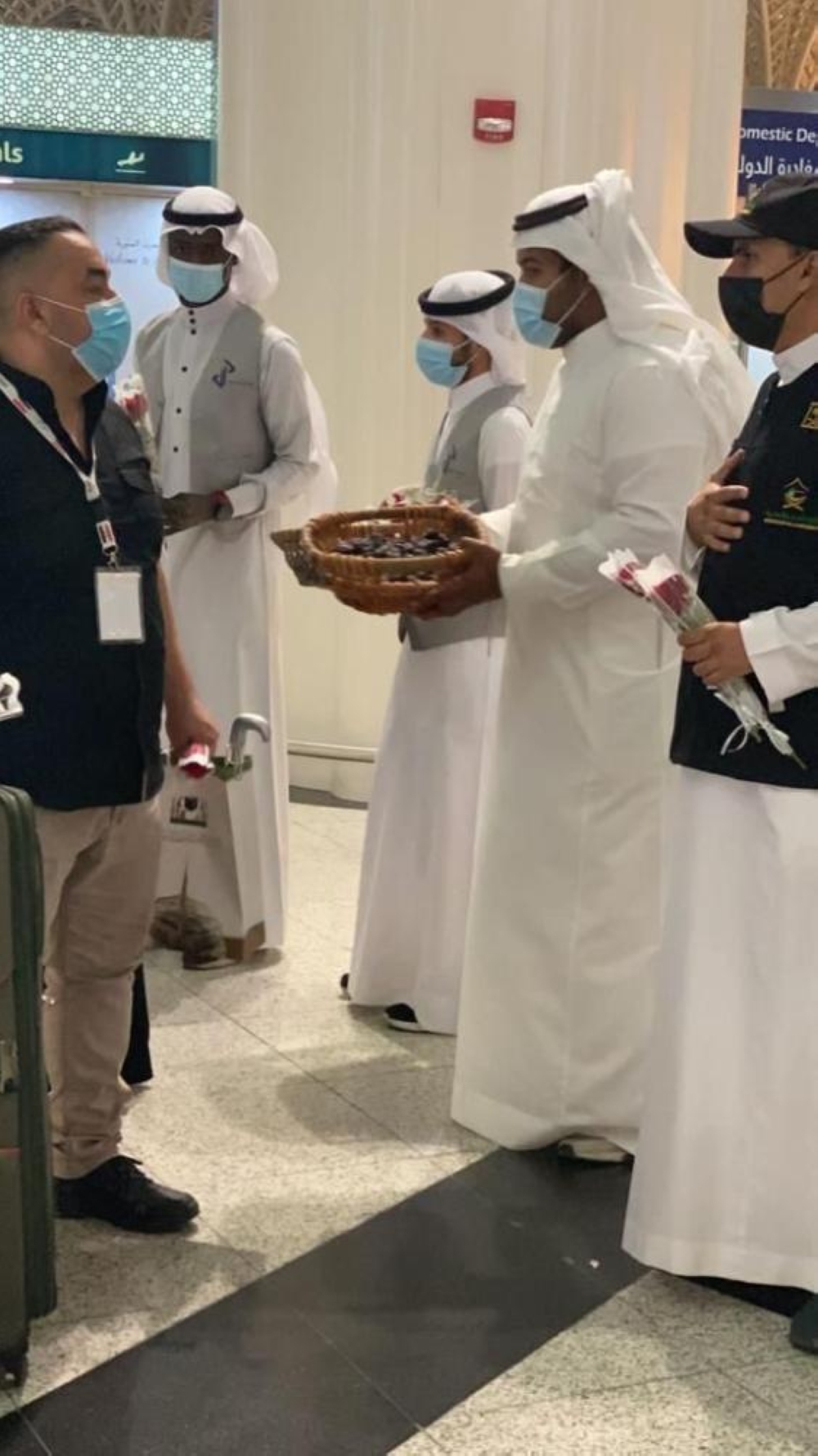 واستُقبل المعتمرون من قبل مسؤولي وزارة الحج والعمرة بالورد، وسط تطبيق كافة الإجراءات الاحترازية.