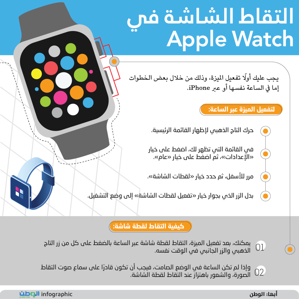 يمكنك، بعد تفعيل الميزة، التقاط لقطة شاشة عبر الساعة بالضغط على كل من زر التاج الذهبي والزر الجانبي في الوقت نفسه.