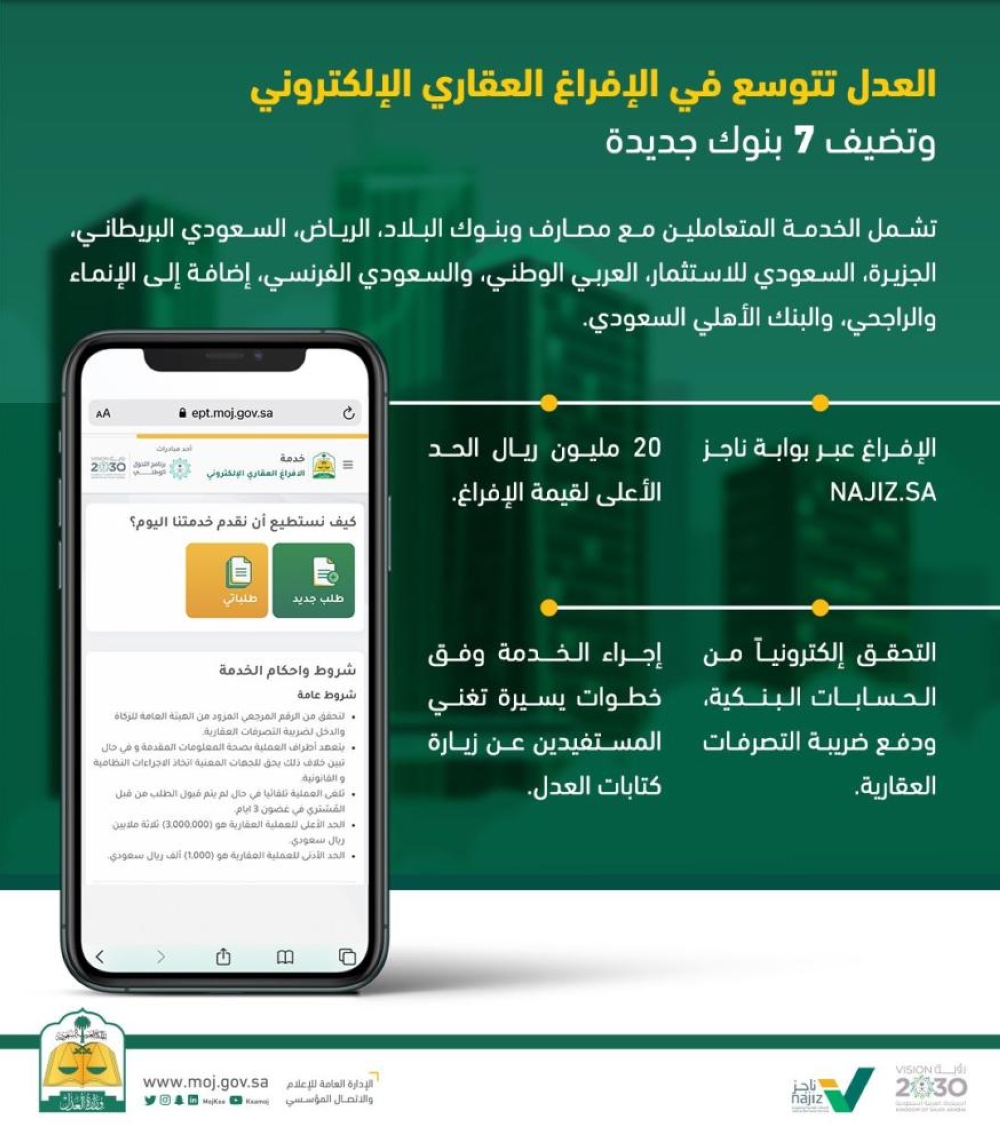 وأكدت أن التوسع في إجراء الخدمة يهدف إلى خدمة شريحة أكبر من المستفيدين عبر إتاحة إيداع مبالغ الصفقات العقارية في حساباتهم البنكية وذلك في عملية إلكترونية متكاملة تبدأ من قبول الأطراف الصفقة، وتحويل المبلغ للبائع ونقل ملكية العقار للمشتري وذلك بشكل إلكتروني متكامل، عبر بوابة ناجز najiz.sa، دون تدخل بشري ودون أي حاجة لزيارة المصرف أو كتابة العدل لإتمام الصفقة.