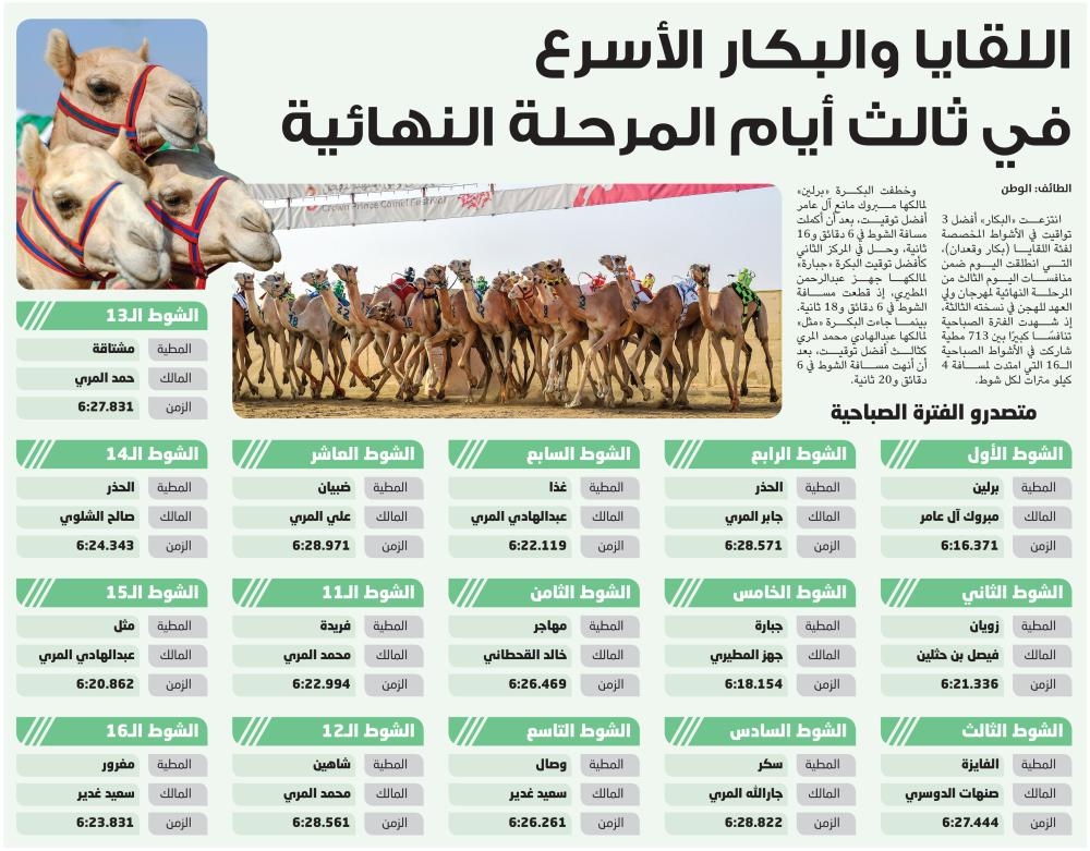 وخطفت البكرة «برلين» لمالكها مبروك مانع آل عامر أفضل توقيت، بعد أن أكملت مسافة الشوط في 6 دقائق و16 ثانية، وحل في المركز الثاني كأفضل توقيت البكرة «جبارة» لمالكها جهز عبدالرحمن المطيري، إذ قطعت مسافة الشوط في 6 دقائق و18 ثانية. بينما جاءت البكرة «مثل» لمالكها عبدالهادي محمد المري كثالث أفضل توقيت، بعد أن أنهت مسافة الشوط في 6 دقائق و20 ثانية.