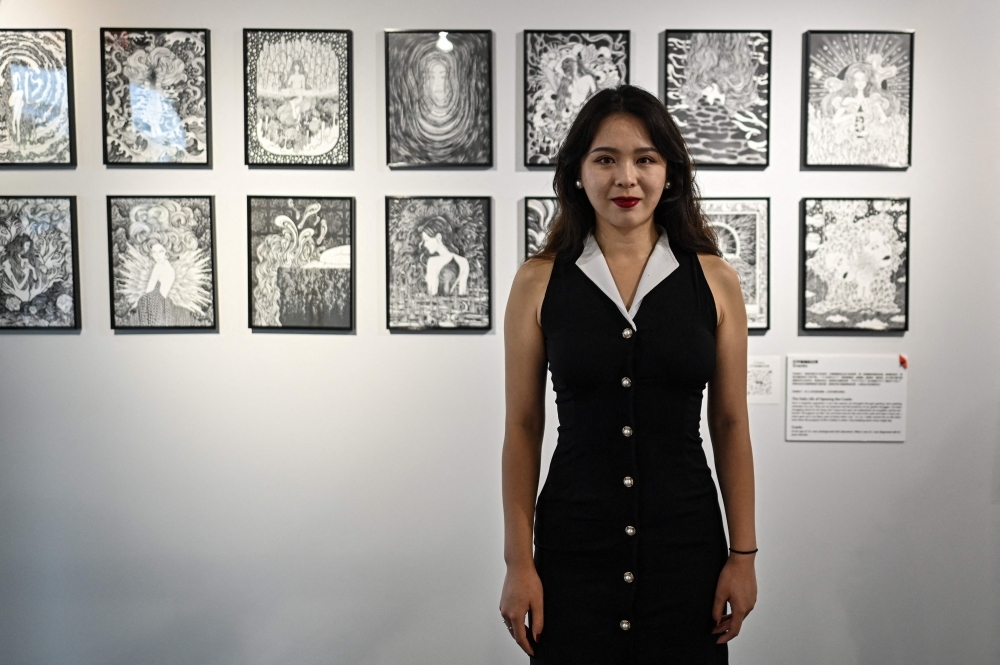 فنانة تقف بجانب رسوماتها، في معرض فني عن الصحة العقلية، يعرض أعمال حوالي 80 فنانًا لزيادة الوعي في شنجهاي. «أ ف ب»