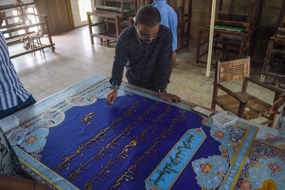 فنان باكستاني يعمل في مشروع كتابة القرآن الكريم، بأحرف مطلية بالذهب في مجلس الفنون الباكستاني، في مدينة كراتشي الساحلية. «أ ف ب»