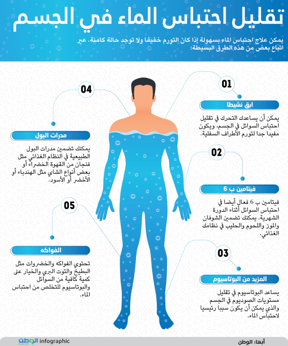 يساعد البوتاسيوم في تقليل مستويات الصوديوم في الجسم والذي يمكن أن يكون سببا رئيسيا لاحتباس الماء.