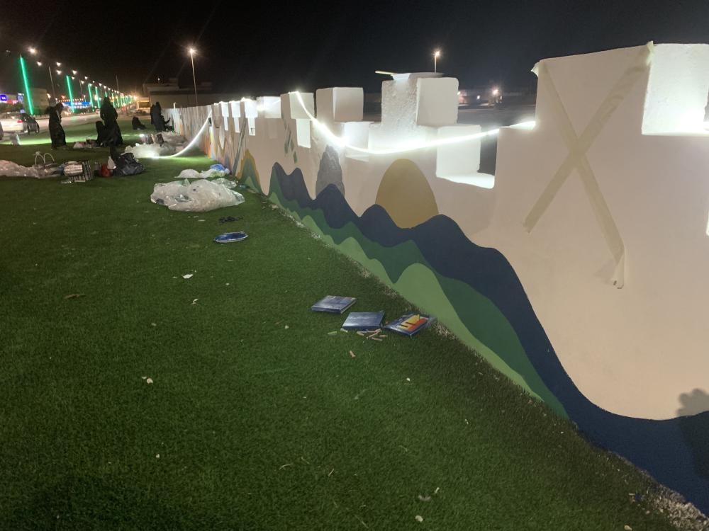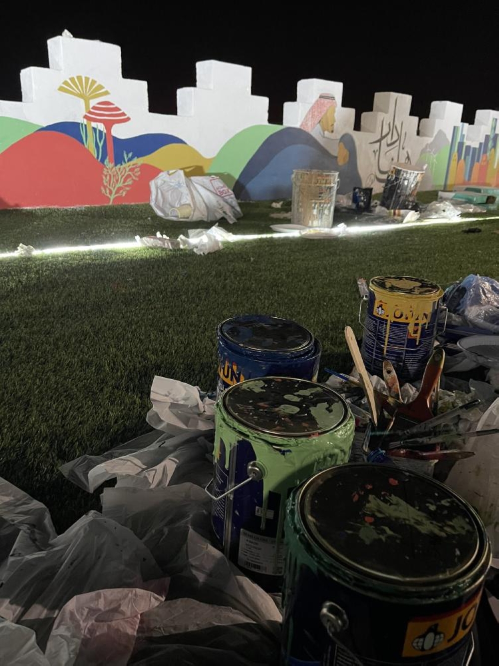 كما كشفت أن الفريق انطلق الجمعة، ويضم 8 طالبات مع معلمتهن للتربية الفنية بالثانوية الثالثة بالبدائع، بدرية سميح العنزي، التي بدورها استوحت رسم الجدارية من الهوية الوطنية لليوم الوطني91، بلمستها الخاصة وأضافت من خلال الجدارية فن النقش العسيري «القَط العسيري» والمعترف به عالميا مؤخراً ضمن قائمة التراث لدى منظمة اليونسكو، ليبدأ العمل على جدار بطول تقريبي 150م، لنصنع الجمال البصري من خلاله.