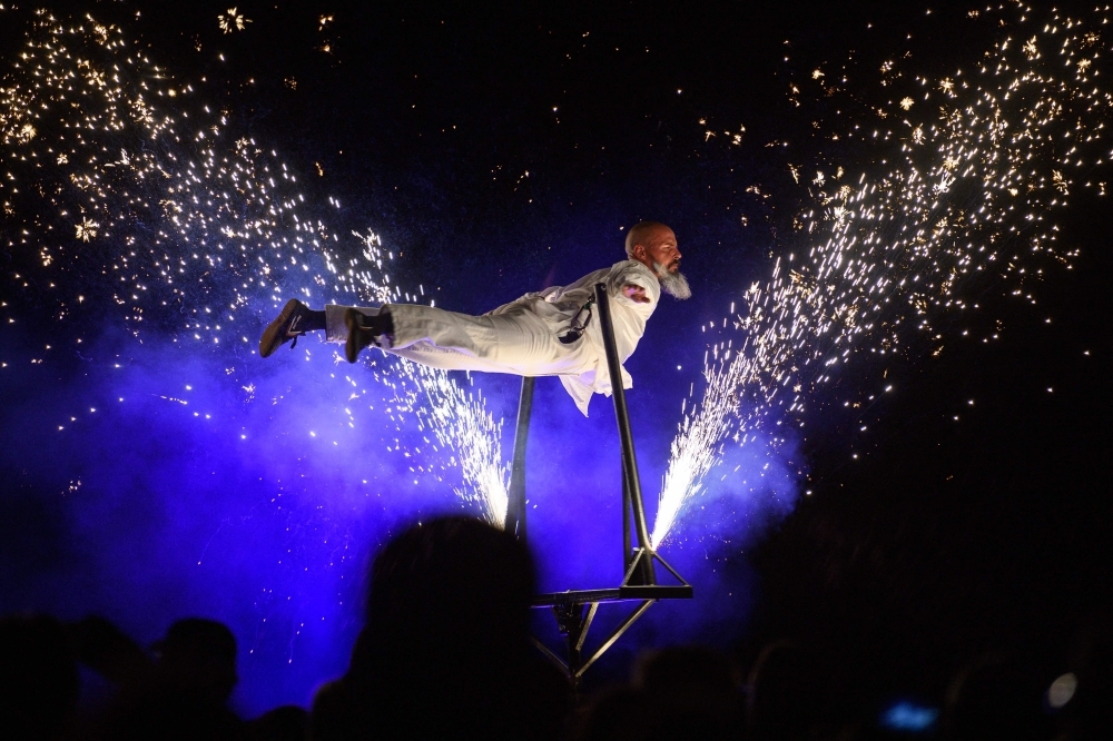 عرض مسرحي في الهواء الطلق يروي قصص الأساطير المحلية والفولكلور، باستخدام أدوات بصرية ومصابيح وألعاب نارية، شمال إنجلترا. (أ ف ب)