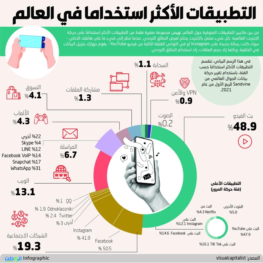 من بين ملايين التطبيقات المتوفرة حول العالم، تهيمن مجموعة صغيرة فقط من التطبيقات الأكثر استخدامًا على حركة الإنترنت العالمية. كل شيء متصل بالإنترنت يحتاج لعرض النطاق الترددي. عندما تنظر إلى شيء ما على هاتفك الذكي - سواء كانت رسالة جديدة على Instagram أو في الثواني القليلة التالية من فيديو YouTube - يقوم جهازك بتنزيل البيانات في الخلفية. وكلما زاد حجم الملفات، زاد استخدام النطاق الترددي.