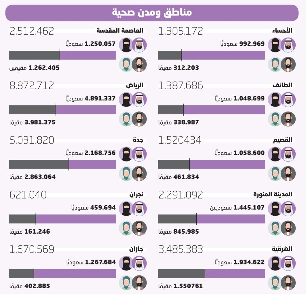 وسجلت المنطقة الصحية في القنفذة - طبقًا لإحصائية وزارة الصحة عن عدد السكان بالمناطق الصحية حسب الجنسية لعام 2020 - نحو 275.622 سعوديًّ، و53667 مقيمًا بمجموع 329.289 شخصًا، تلتها المنطقة الصحية بالحدود الشمالية بـ 304.873 سعوديًّا، و85.783 بمجموع 390.656 شخصًا، في الوقت الذي سجلت المنطقة الصحية في بيشة 332.860 سعوديًّا و81.337 بمجموع 414.197 شخصًا.