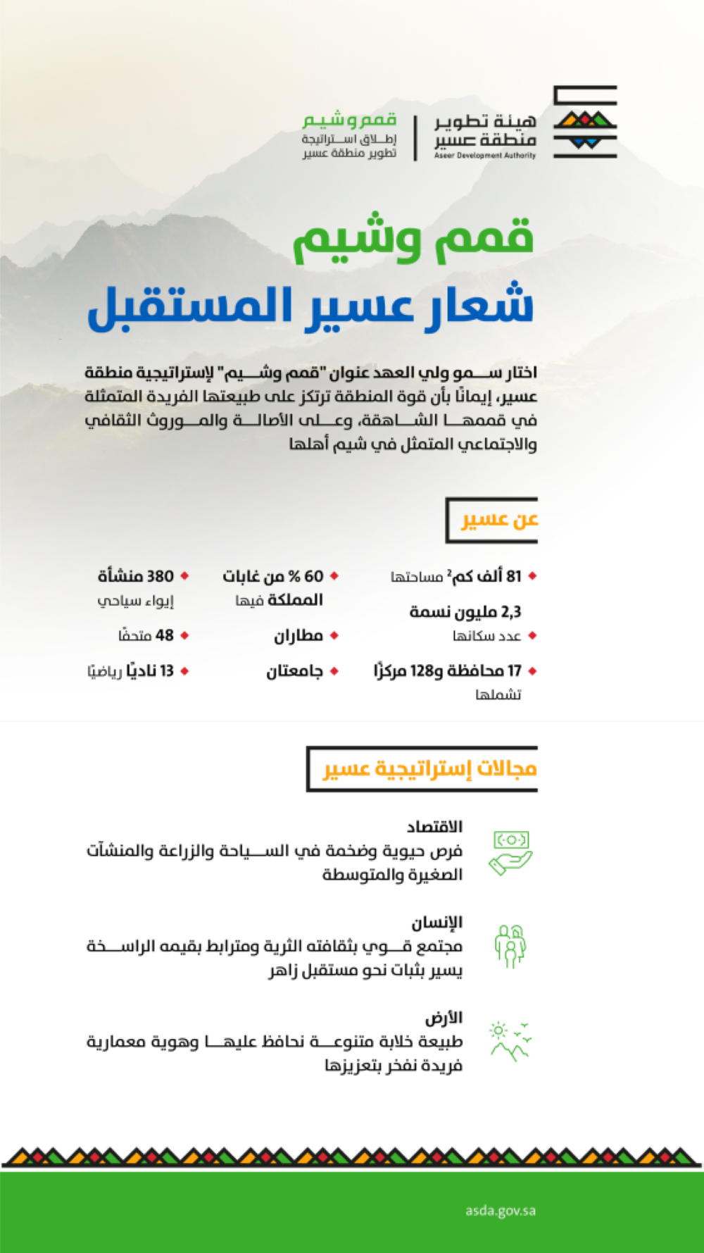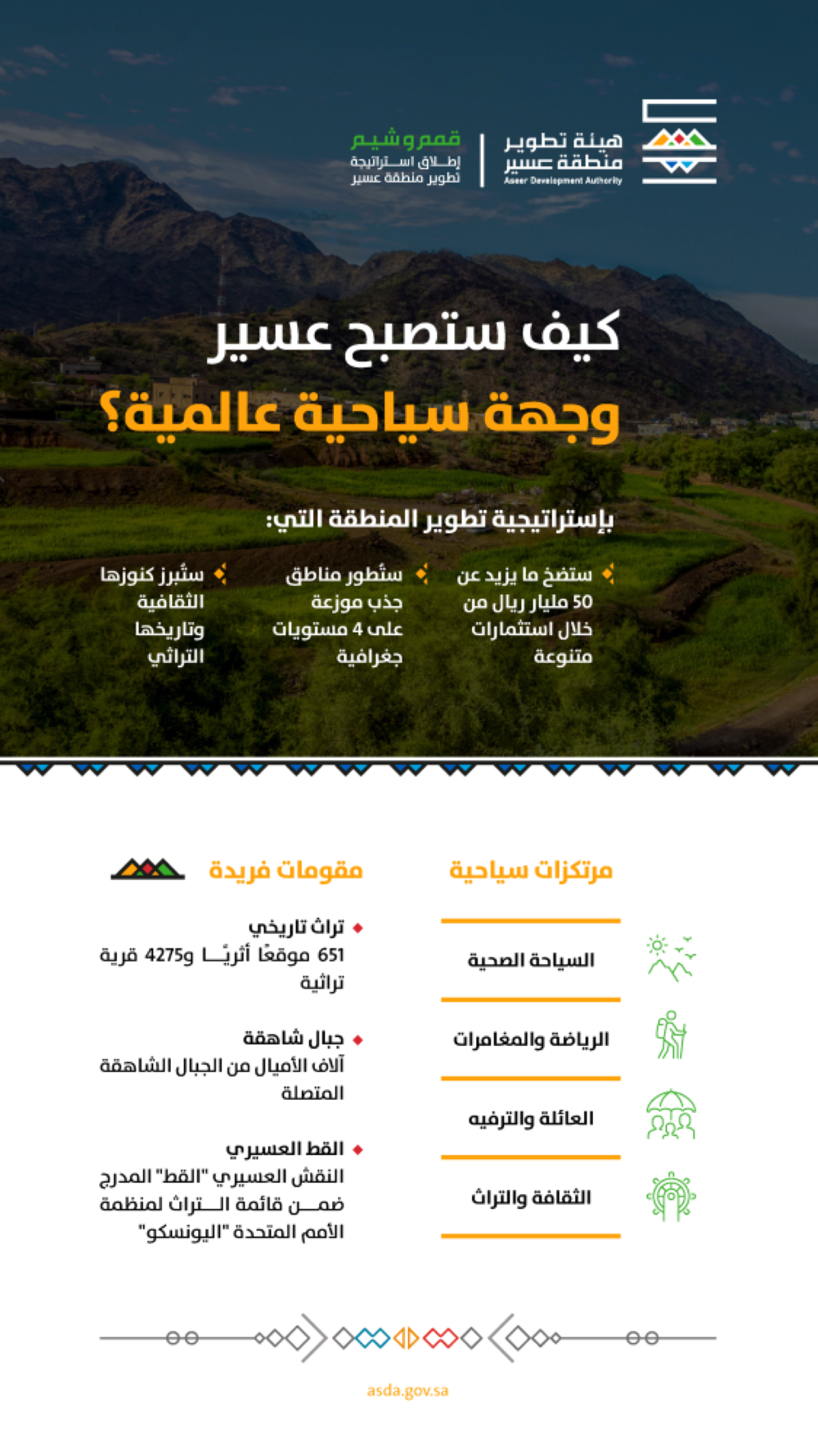 - تحويل منطقة عسير إلى وجهة سياحية عالمية طوال العام.