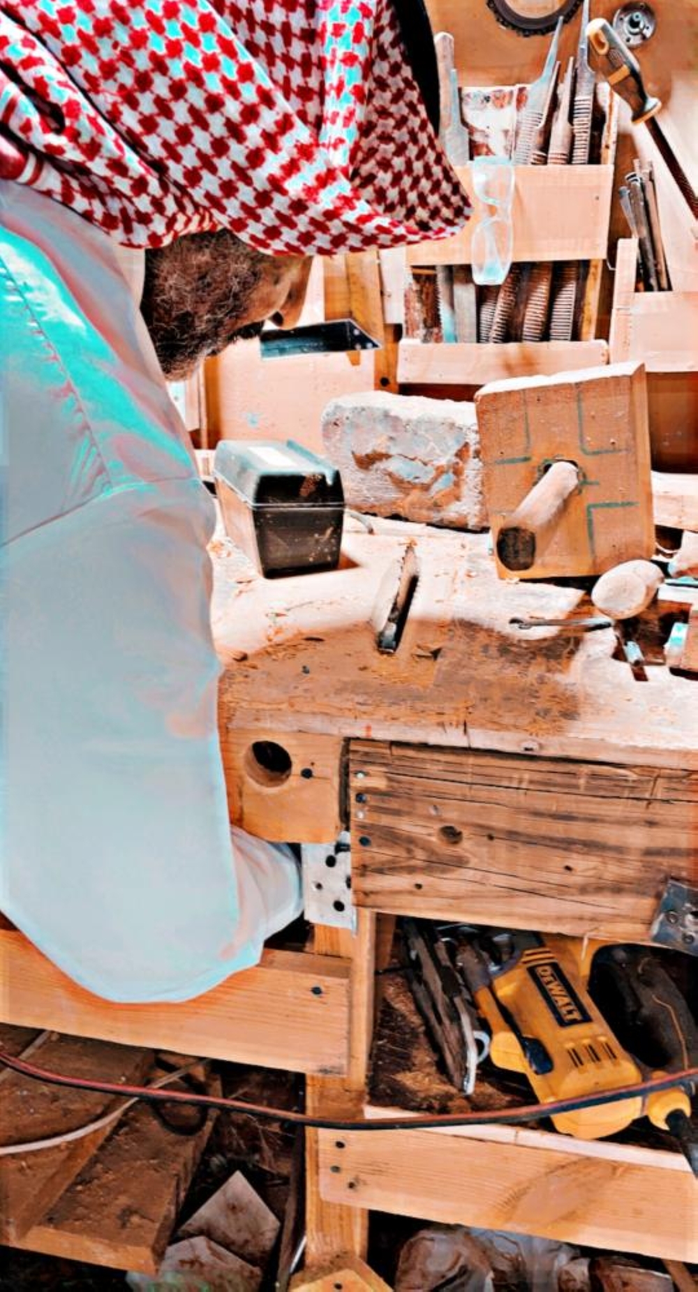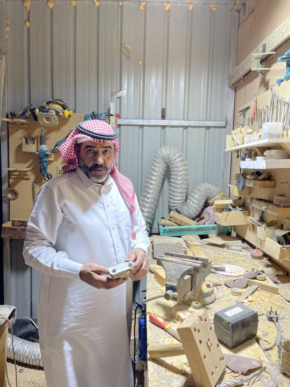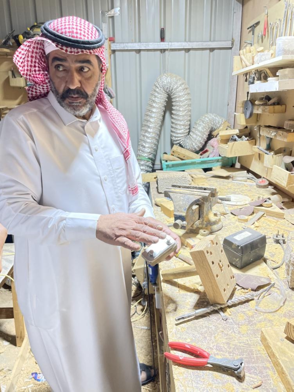 من ورشته المتواضعة في منزله في محافظة دومة الجندل، يقول الفنان فيصل النعمان لـ«الوطن» «ملامح موهبتي ظهرت منذ الصغر، فقد كنت أهوى الأعمال الفنية وترتيبها، ولكن لم أُظهر ذلك بشكل واضح، كون المجتمع لم يكن يؤمن وقتها بمثل تلك الهواية، ومع انتصاف العقد الثالث من عمري، كنت اشترى بعض اللحم من إحدى الملاحم في محافظة دومة الجندل، واستوقفني جذع شجرة ملقى أمامها، كان الجزار يستخدمه لتقطيع اللحم، قبل أن يستبدله بآلة، ومن ضرب الساطور على الجذع تشكّل عمل فني، أخذته بعد أن استأذنت من صاحبه، وعملت عليه، واستطاع أن يخرج ما بداخلي من هواية للنحت».