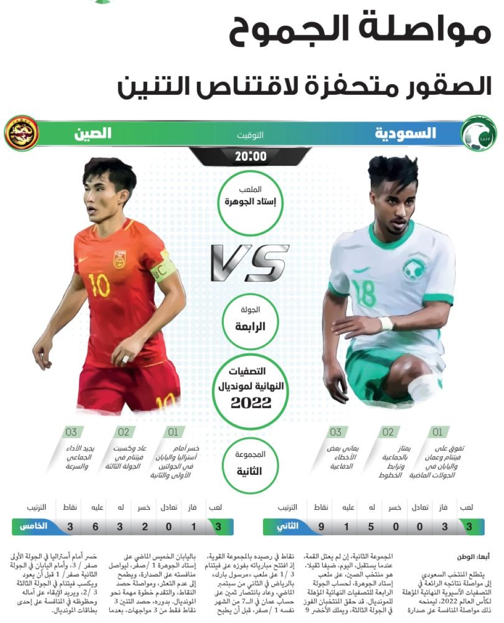 يتطلع المنتخب السعودي إلى مواصلة نتائجه الرائعة في التصفيات الآسيوية النهائية المؤهلة لكأس العالم 2022، ليمنحه ذلك مواصلة المنافسة على صدارة المجموعة الثانية، إن لم يعتل القمة، عندما يستقبل، اليوم، ضيفا ثقيلا، هو منتخب الصين، على ملعب إستاد الجوهرة، لحساب الجولة الرابعة للتصفيات النهائية المؤهلة للمونديال. قد حقق المنتخبان الفوز في الجولة الثالثة، ويملك الأخضر 9 نقاط في رصيده بالمجموعة القوية، إذ افتتح مبارياته بفوزه على فيتنام 3 /1 على ملعب «مرسول بارك» بالرياض في الثاني من سبتمبر الماضي، وعاد بانتصار ثمين على حساب عمان في الـ7 من الشهر نفسه 1 /صفر، قبل أن يطيح باليابان الخميس الماضي على إستاد الجوهرة 1 /صفر، ليواصل منافسته على الصدارة، ويطمح إلى عدم التعثر، ومواصلة حصد النقاط، والتقدم خطوة مهمة نحو المونديال. بدوره، حصد التنين 3 نقاط فقط من 3 مواجهات، بعدما خسر أمام أستراليا في الجولة الأولى صفر / 3، وأمام اليابان في الجولة الثانية صفر/ 1 قبل أن يعود ويكسب فيتنام في الجولة الثالثة 3 /2، ويريد الإبقاء على آماله وحظوظه في المنافسة على إحدى بطاقات المونديال.