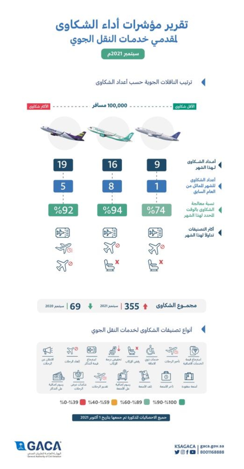 وكشفت الهيئة عن إجمالي الشكاوى التي رفعها المسافرين على الناقلات الجوية خلال شهر سبتمبر الماضي، وقد بلغت (355) شكوى، ورصد المؤشر أن الخطوط الجوية السعودية جاءت كأقل شركات الطيران شكاوى بواقع (9) شكاوى لكل 100 ألف مسافر وبنسبة معالجة للشكوى بالوقت المحدد لشهر سبتمبر وصلت إلى 74%، بينما حل طيران ناس ثانيا بواقع (16) شكوى لكل 100 ألف مسافر خلال الشهر الماضي وبنسبة معالجة للشكوى بالوقت المحدد وصلت إلى 94%، وجاء ثالثا طيران أديل حيث وصل عدد الشكاوى إلى (19) شكوى لكل 100 ألف مسافر وبنسبة معالجة للشكوى بالوقت المحدد وصلت إلى 92%.