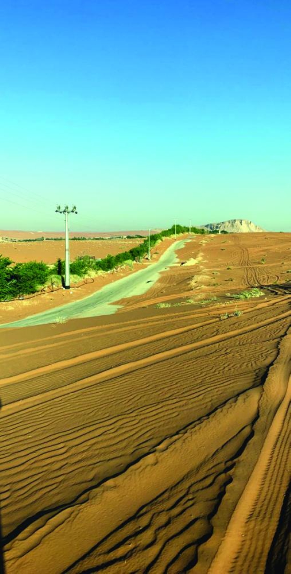 ورصدت «الوطن» الطرق المؤدية للمتنزه من جهتي الغرب والجنوب التي تراكمت عليها الرمال، فيما دعا العديد من سالكي الطريق الجهات المعنية إلى إيجاد حل جذري لإيقاف الزحف بتوفير معدات لإزاحة الرمال أو وضع مصدات نباتية حفاظاً على سلامة المارة.