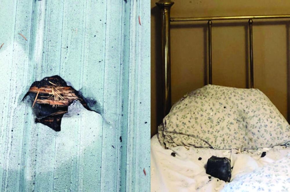 لكن روث هاميلتون، المقيمة في المنطقة منذ فترة طويلة، كانت نائمة في ذلك الوقت، حتى استيقظت مذعورة على صوت ارتطام شيء بسقف غرفتها وإحساس بتناثر حطام على وجهها.