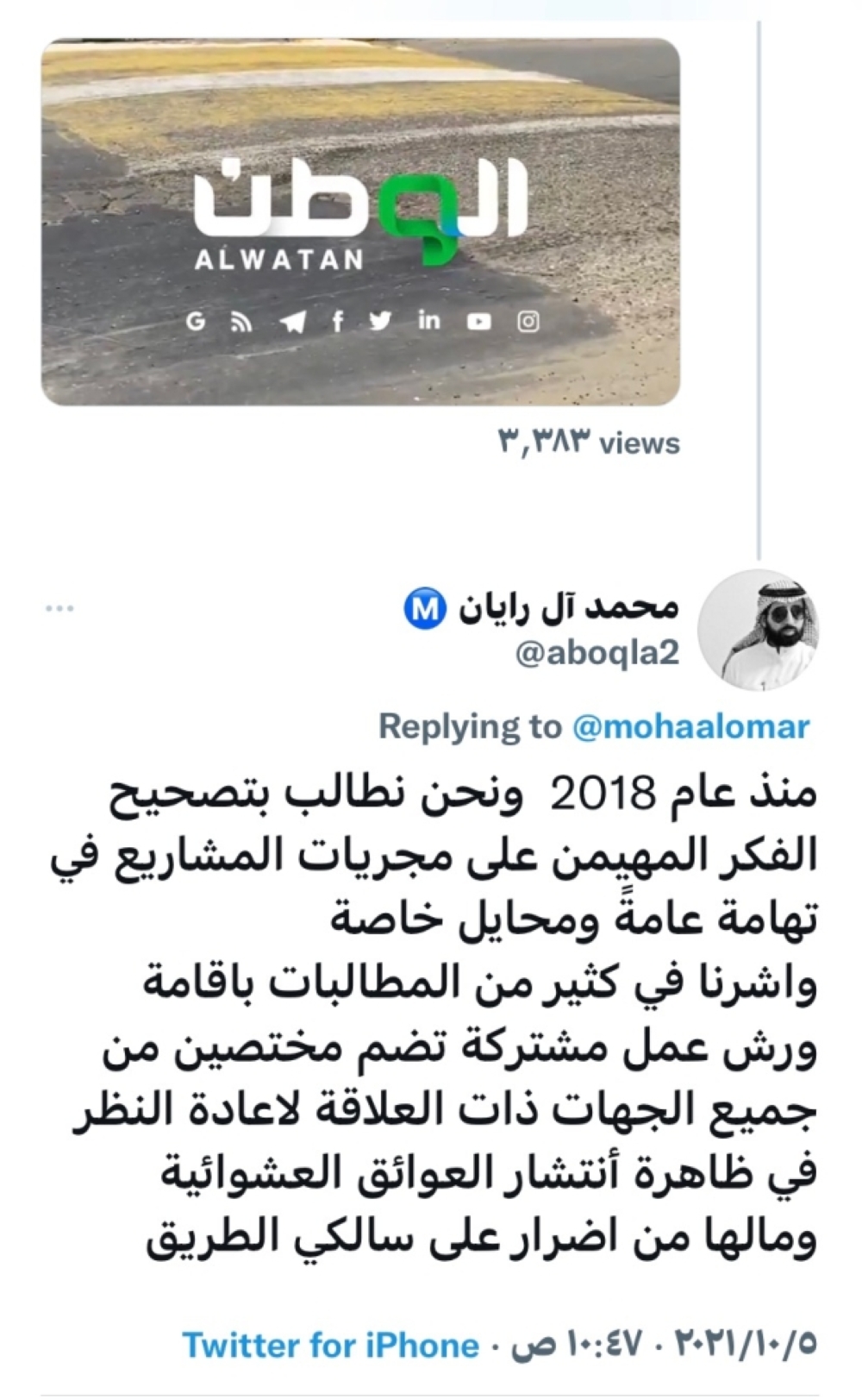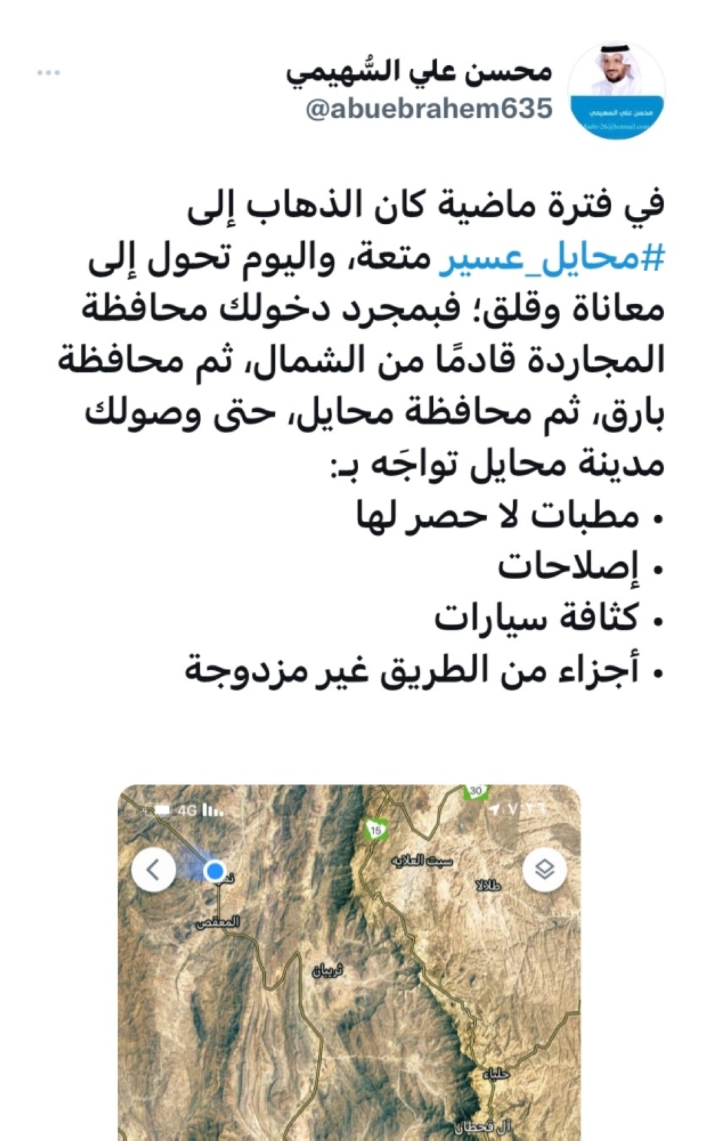 وتفاعل المغردون مع خبر «الوطن» حول كثرة المطبات في طرق تهامة، وقال عمر الشهري: مطبات وحفريات من المجاردة إلى محايل عسير، الطريق متهالك جدا ويحتاج صيانه كاملة، الترقيع ما ينفع مع تجمع مياه الأمطار في الطرق، ترجع نفس المشكلة، رفعنا بلاغات ولم تحل المشكلة، أما محمد آل رايان فقال، منذ عام 2018 ونحن نطالب بتصحيح الفكر المهيمن على مجريات المشاريع في تهامة عامةً ومحايل خاصة. وأشرنا في كثير من المطالبات بإقامة ورش عمل مشتركة، تضم مختصين من جميع الجهات ذات العلاقة، لإعادة النظر في ظاهرة انتشار العوائق العشوائية، ومالها من أضرار على سالكي الطريق.