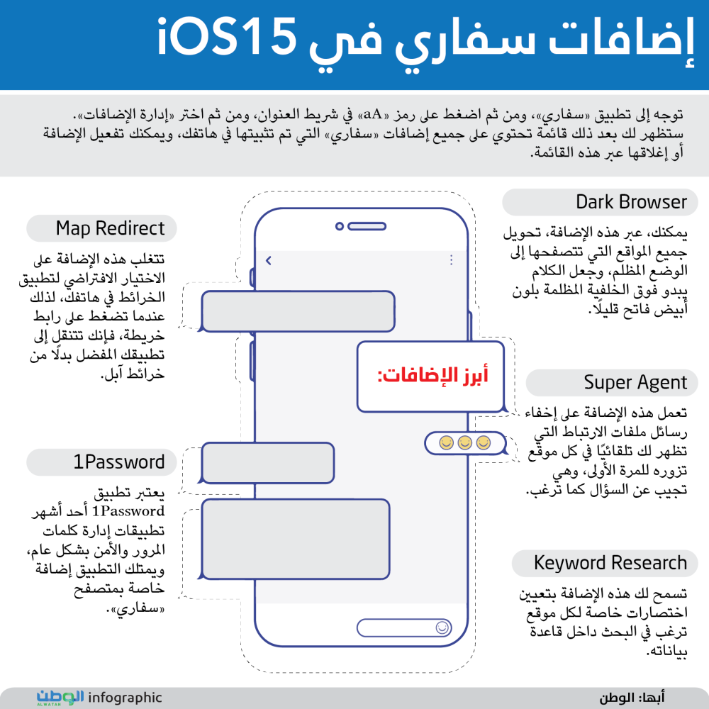 ستظهر لك بعد ذلك قائمة تحتوي على جميع إضافات «سفاري» التي تم تثبيتها في هاتفك، ويمكنك تفعيل الإضافة أو إغلاقها عبر هذه القائمة.