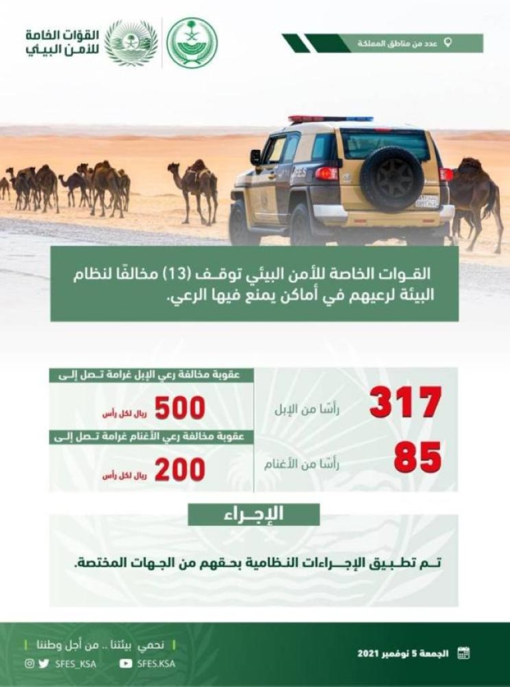 وأوضح المتحدث الرسمي للقوات الخاصة للأمن البيئي الرائد رائد المالكي، أن الإجراءات النظامية طبقت بحق المخالفين، مبينًا أن عقوبة مخالفة رعي الإبل غرامة تصل إلى 500 ريال لكل رأس، وعقوبة مخالفة رعي الأغنام غرامة تصل إلى 200 ريال لكل رأس.