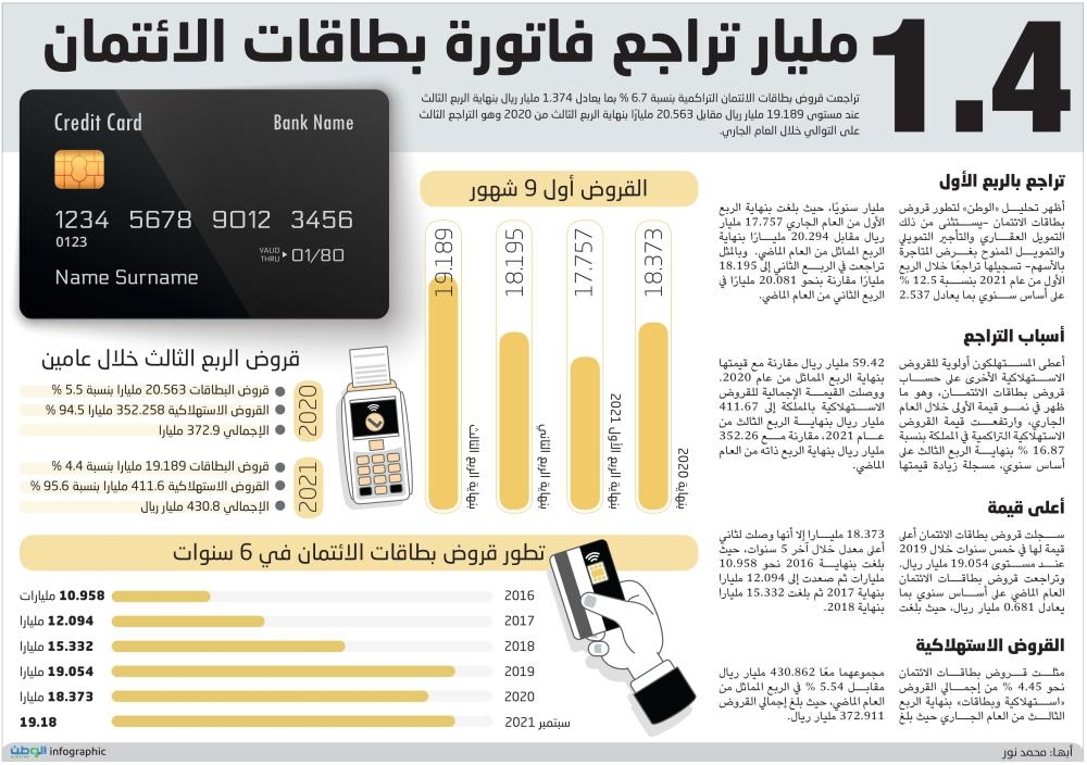 مثلت قروض بطاقات الائتمان نحو 4.45 % من إجمالي القروض «استهلاكية وبطاقات» بنهاية الربع الثالث من العام الجاري حيث بلغ مجموعهما معًا 430.862 مليار ريال مقابل 5.54 % في الربع المماثل من العام الماضي، حيث بلغ إجمالي القروض 372.911 مليار ريال.