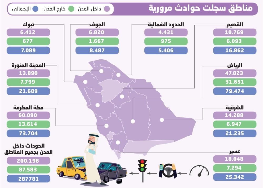 ووفقا للإحصائية جاءت منطقة الباحة ثانيا بـ 985 حادثا داخل المدينة، و659 حادثا خارجها بمجموع 1.644 حادث، وجاءت منطقه حائل ثالثا بعدد الحوداث داخل المدينة بـ 3.564 حادث بينما سجلت خارجها 1.220 بمجموع 4.784.