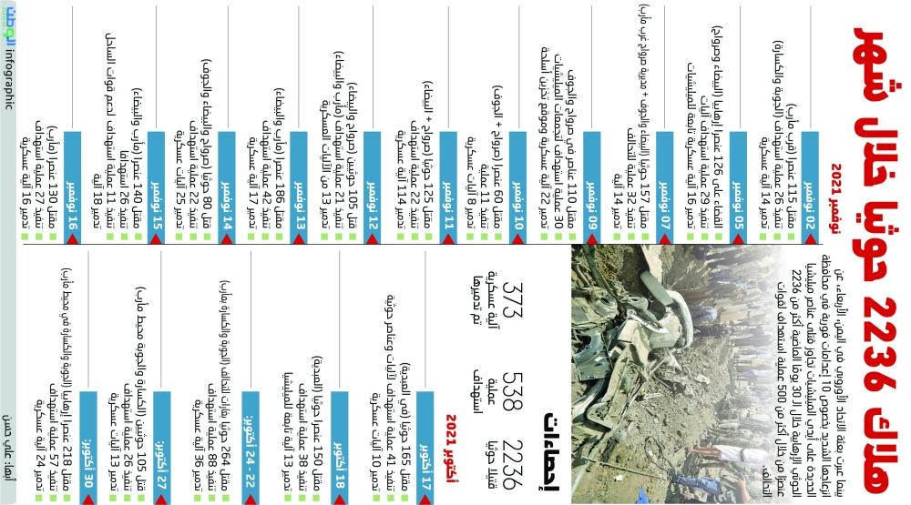 02 نوفمبر: - مقتل 115 عنصرا (قرب مأرب) - تنفيذ 26 عملية استهداف (الجوبة والكسارة) - تدمير 14 آلية عسكرية 05 نوفمبر: - القضاء على 126 عنصرا إرهابيا (البيضاء وصرواح) - تنفيذ 29 عملية استهداف آليات - تدمير 16 آلية عسكرية تابعة للميليشيات 07 نوفمبر: - مقتل 157 حوثيا (محافظتي البيضاء والجوف + مديرية صرواح غرب مأرب) - تنفيذ 32 عملية للتحالف - تدمير 14 آلية 09 نوفمبر: - مقتل 110 عناصر في صرواح والجوف - 30 عملية استهداف لتجمعات الميليشيات - تدمير 22 آلية عسكرية وموقع تخزين أسلحة 11 نوفمبر: - مقتل 60 عنصرا (صرواح + الجوف) - تنفيذ 11 عملية - تدمير 8 آليات عسكرية 11 نوفمبر: - مقتل 125 حوثيا (صرواح + البيضاء) - تنفيذ 22 عملية استهداف - تدمير 114 آلية عسكرية 12 نوفمبر: - قتل 105 حوثيين (صرواح والبيضاء) - تنفيذ 21 عملية استهداف (مأرب والبيضاء) - تدمير 13 من الآليات العسكرية 13 نوفمبر: - مقتل 186 عنصرا (مأرب والبيضاء) - تنفيذ 42 عملية استهداف - تدمير 17 آلية عسكرية 14 نوفمبر: - قتل 80 حوثيا (صرواح والبيضاء والجوف) - تنفيذ 22 عملية استهداف - تدمير 25 آليات عسكرية 15 نوفمبر: - مقتل 140 عنصرا (مأرب والبيضاء) - تنفيذ 26 استهدافا - تنفيذ 11 عملية استهداف ضد الميليشيات لدعم قوات الساحل وحماية المدنيين - تدمير 18 آلية 16 نوفمبر: - مقتل 130 عنصرا (مأرب) - تنفيذ 27 عملية استهداف - تدمير 16 آلية عسكرية