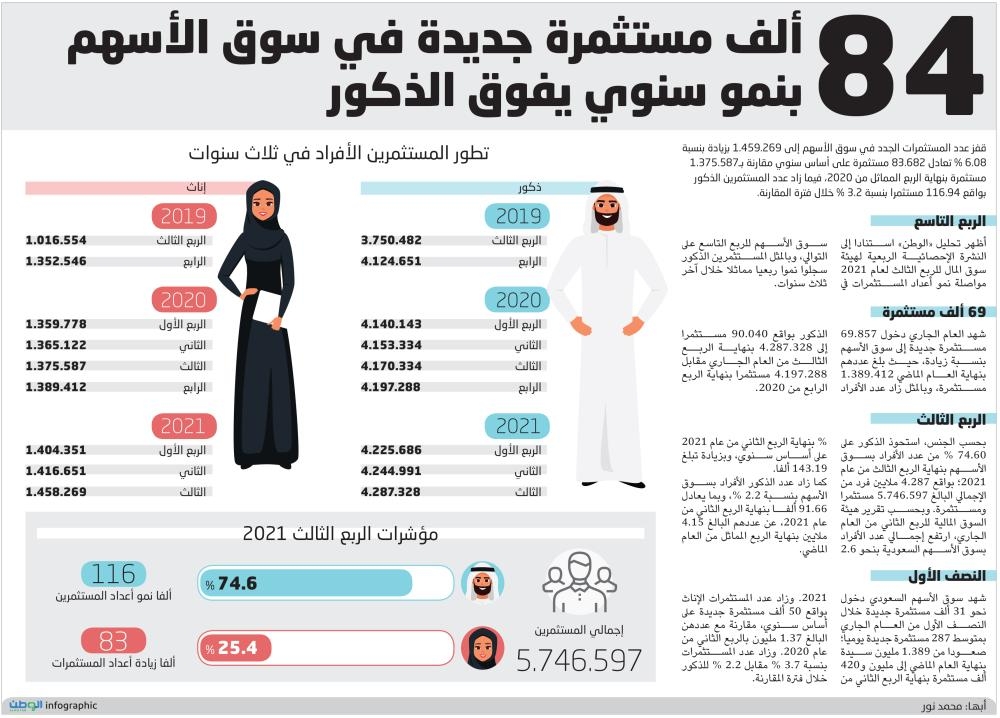 شهد العام الجاري دخول 69.857 مستثمرة جديدة إلى سوق الأسهم بنسبة زيادة، حيث بلغ عددهم بنهاية العام الماضي 1.389.412 مستثمرة، وبالمثل زاد عدد الأفراد الذكور بواقع 90.040 مستثمرا إلى 4.287.328 بنهاية الربع الثالث من العام الجاري مقابل 4.197.288 مستثمرا بنهاية الربع الرابع من 2020.