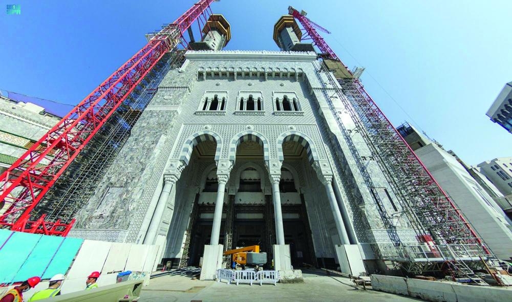 وقال وكيل الرئيس العام للمشاريع والدراسات الهندسية المهندس محمد بن سليمان الوقداني، إن الأعمال الإنشائية مستمرة على وتيرة عالية، حيث بلغت نسبة الانتهاء من أعمال الإنشاء بمنارتي باب الملك عبدالعزيز بما يزيد على 88.5%، مضيفاً أن أعمال التشطيبات (رخام الأعمدة والزخارف والحوائط) بلغت 98%، كما شملت تركيب الأسقف بنسبة 100%.