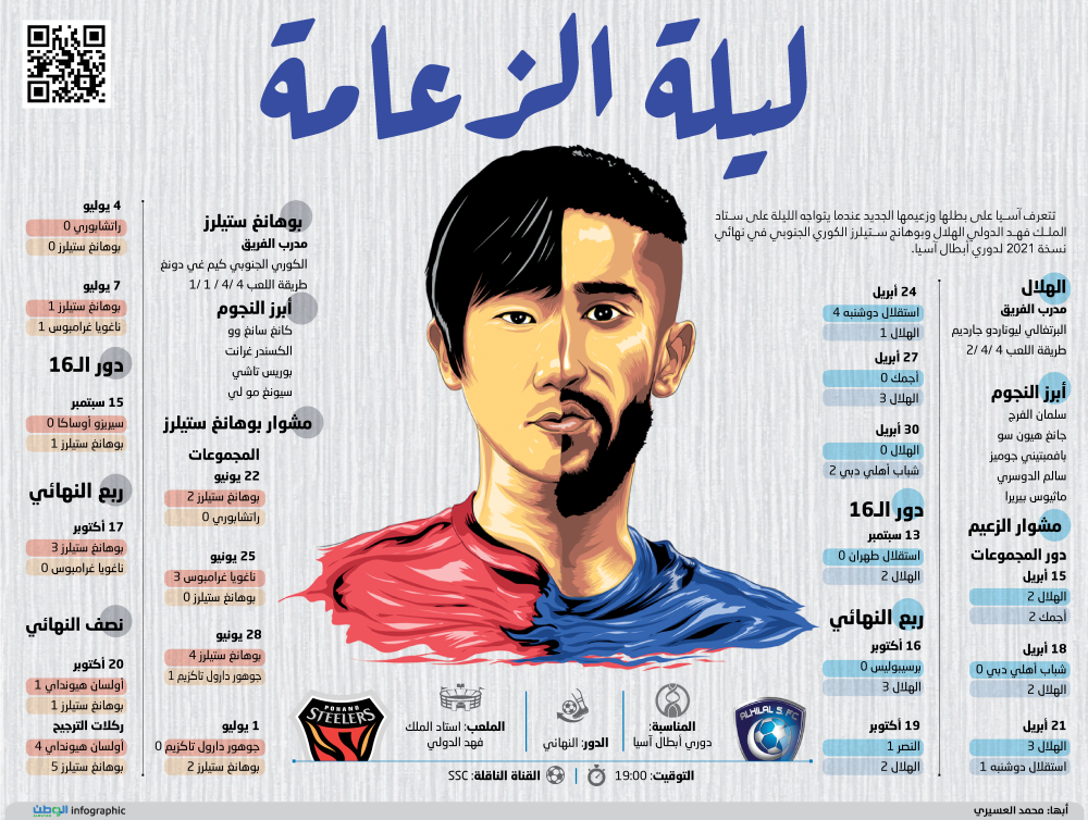 تتعرف آسيا على بطلها وزعيمها الجديد عندما يتواجه الليلة على ستاد الملك فهد الدولي الهلال وبوهانج ستيلرز الكوري الجنوبي في نهائي نسخة 2021 لدوري أبطال آسيا.