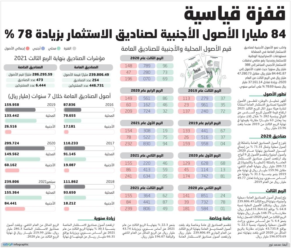أظهر تحليل «الوطن» لتطور الأصول الأجنبية لصناديق الاستثمار العامة استنادًا لنشرة هيئة سوق المال للربع الثالث 2021 ارتفاع قيمة الأصول للربع السادس على التوالي وبنسبة 282 % خلال ثلاث سنوات بما يعادل 63 مليارًا مقارنة بقيمتها في نهاية الربع الثالث من 2019 عندما بلغت 23.96 مليار ريال.
