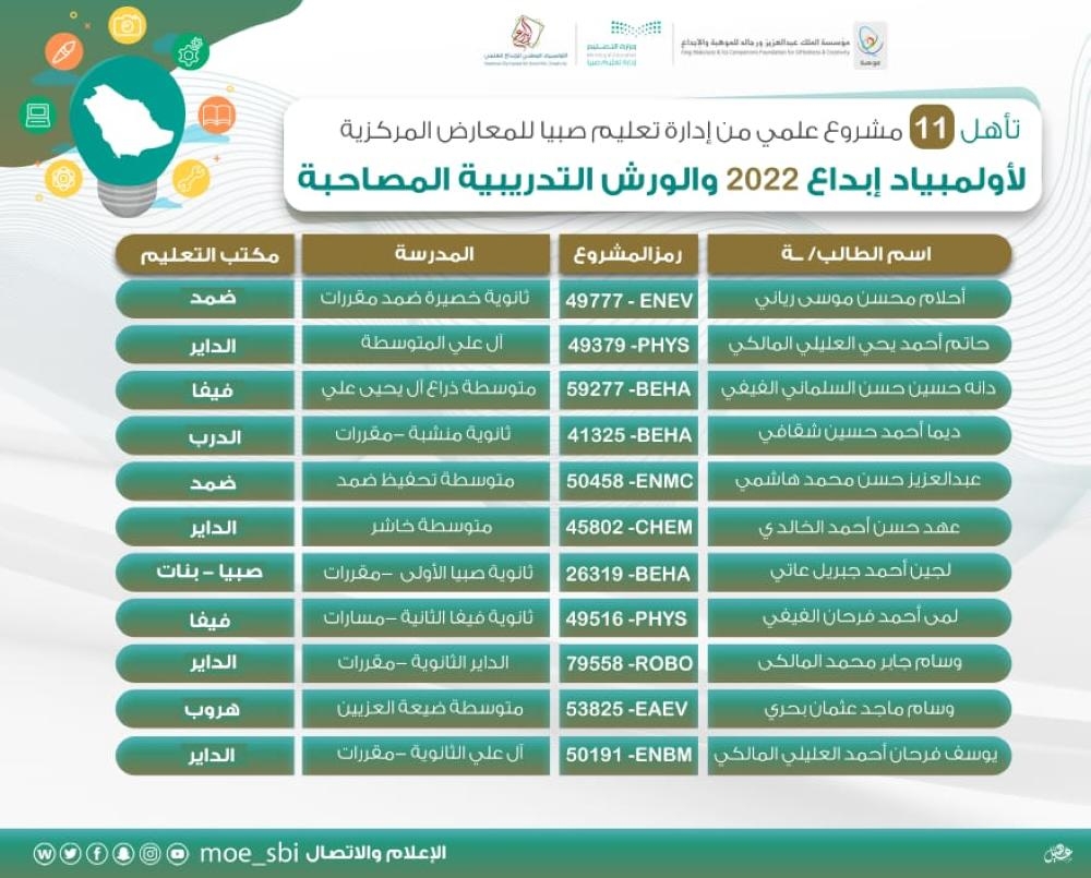 وأوضح المساعد للشؤون التعليمية للبنين ناصر أحمد معافا أن عدد طلبة تعليم صبيا المسجلين في المشروع قد بلغ 2.996 طالبا وطالبة، فيما بلغت الملفات المرشحة للمنافسة في المعارض المركزية للأولمبياد 265 ملفا ومشروعا بواقع 87 للبنين و178 ملفاً للبنات.