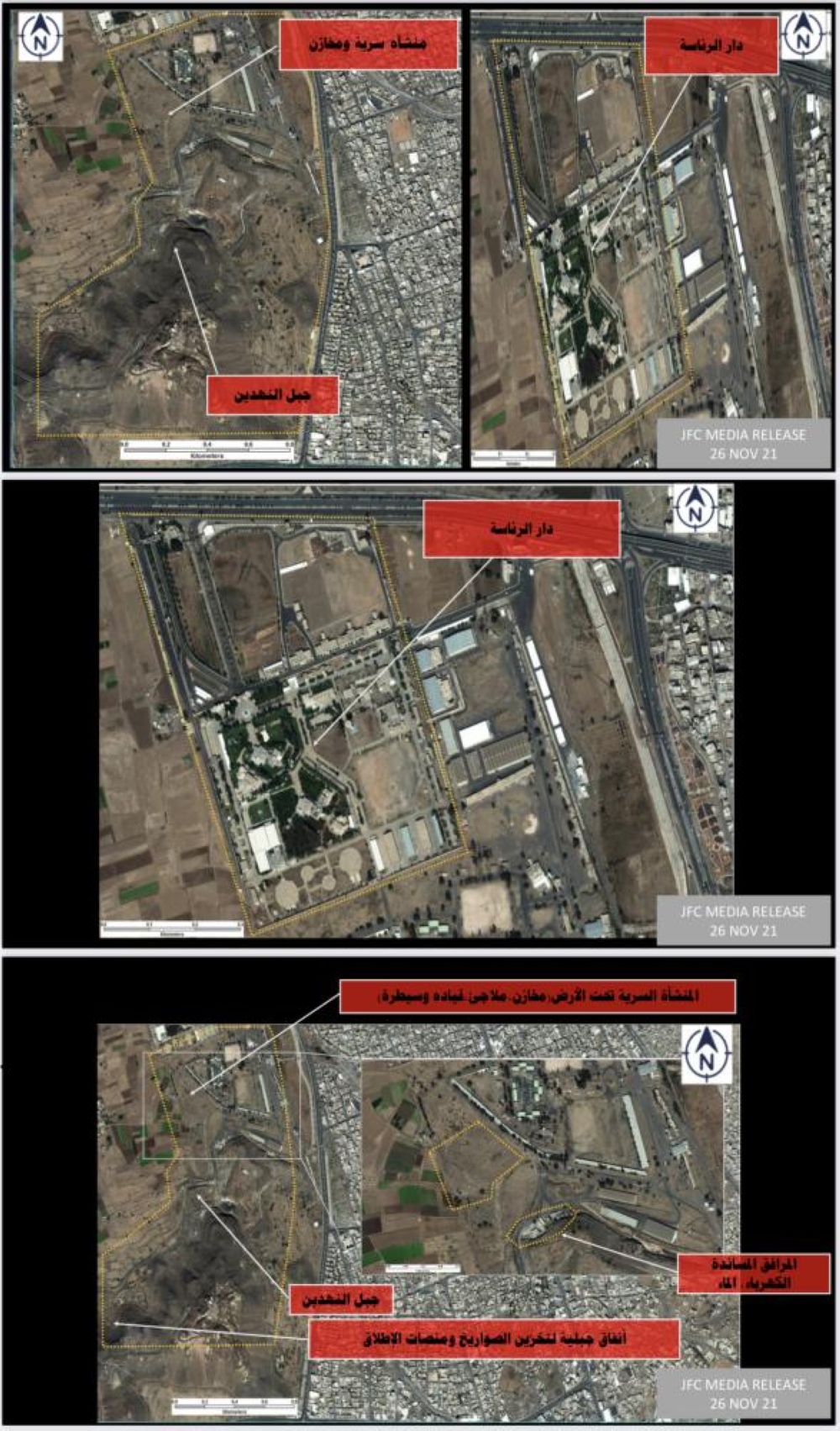 وتبين الصور الاستخبارية والفضائية تفاصيل ارتباط قصر دار الرئاسة بمنشأة سرية تحت الأرض تقع جنوب دار الرئاسة وترتبط بجبل النهدين.