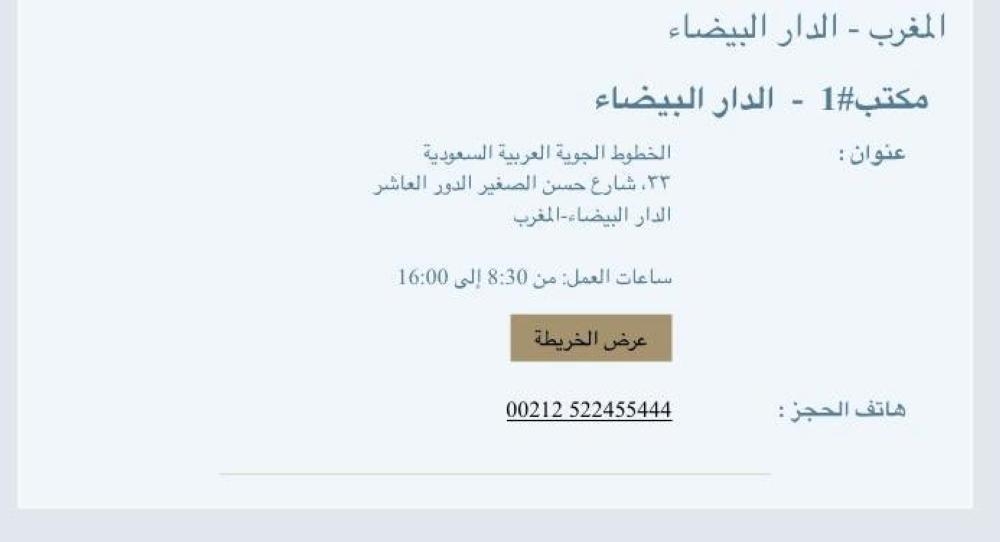 وأضافت السفارة أن من لا تتوافر لديه تذكرة سفر على طيران الخطوط السعودية من مدينة الدار البيضاء إلى السعودية فعليه التوجه إلى مكتب مبيعات الخطوط السعودية بمدينة الدار البيضاء لشراء التذاكر. ووضعت صورة توضح موقع مكتب مبيعات الخطوط وعنوانه وأرقام هواتفه.
