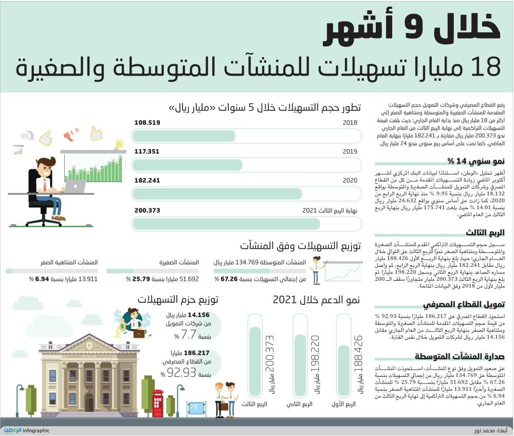 أظهر تحليل «الوطن» استنادًا لبيانات البنك المركزي لشهر أكتوبر الماضي زيادة التسهيلات المقدمة من كل من القطاع المصرفي وشركات التمويل للمنشآت الصغيرة والمتوسطة بواقع 18.132 مليار ريال بنسبة 9.95 % منذ نهاية الربع الرابع من 2020، كما زادت على أساس سنوي بواقع 24.632 مليار ريال بنسبة 14.01 % حيث بلغت 175.741 مليار ريال بنهاية الربع الثالث من العام الماضي.