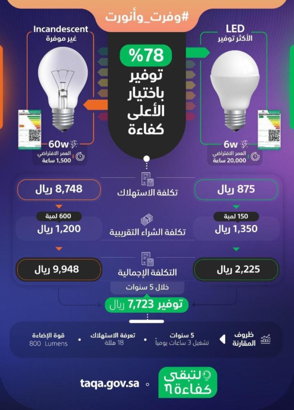 أوضح المركز السعودي لكفاءة الطاقة من خلال حملته للتوعية بأهمية الحفاظ على الطاقة من خلال المصابيح الكهربائية ومختلف أنواع الإنارة #وفرت_ونورت والتي من خلالها يستطيع المستهلك على التوفير في فواتير الكهرباء. حيث أوضح المركز أن الفرق بين مصابيح الإنارة من نوع LED والتي تكون في المستوى الأخضر بإمكانها توفير ما يصل إلى 78% توفير في استهلاك الطاقة مقارنة بالمصابيح من نوع Incandescent غير الموفرة. حيث اشتملت المقارنة أن المصابيح الموفرة عمرها الافتراضي يصل إلى 20.000 ساعة بقدرة 6W، بينما المصابيح العادية فعمرها الافتراضي يصل 1500 ساعة فقط وتستهلك 60W. وفي مقارنة قام بها المركز السعودي لكفاءة الطاقة اعتمد خلالها فترة تشغل اللمبات لمدة 3 ساعات يوميا طوال خمس سنوات وبتعرفة استهلاك بلغت 18 هللة وقوة إضاءة 800 Lumens اتضح أن المصابيح الموفرة للطاقة تستهلك ما يعادل 875 ريالًا لعدد 150 لمبة بتكلفة شراء تبلغ 1350 ريالًا، بينما المصابيح غير الموفرة للطاقة وصلت تكلفة استهلاكها لـ 8748 ريالًا لعدد 600 لمبة بتكلفة شراء 1200 ريال، وبذلك تكون التكلفة الإجمالية للمصباح الموفر للطاقة وصل إلى 2225 ريالًا، بينما بلغت التكلفة الإجمالية للمصباح غير الموفر للطاقة 9948 ريالًا، ويتضح أن المبلغ الذي يمكن توفيره خلال فترة الخمس سنوات هو 7723 ريالًا عند استخدام المصابيح الموفرة للطاقة.