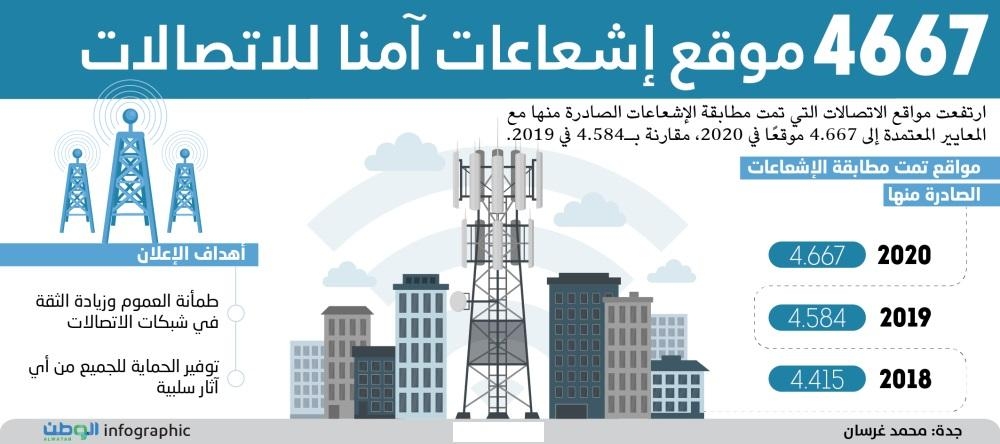 وكشفت هيئة الاتصالات وتقنية المعلومات في تقريرها السنوي مواقع الاتصالات التي تمت مطابقة الإشعاعات الصادرة منها في عام 2018 بنحو 4.415 موقعًا، مشيرة إلى أن أهمية ذلك تكمن في طمأنة العموم وزيادة ثقة المستخدمين بشبكات الاتصالات وتوفير الحماية للجميع من أي آثار سلبية.