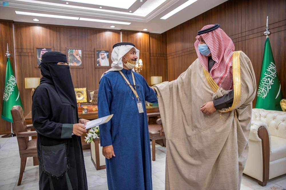 كرم أمير منطقة حائل الأمير عبدالعزيز بن سعد، الطالبة جوري الزعيزع الفائزة بجائزة مكتب التربية العربي لدول الخليج للتفوق الدراسي، وذلك خلال استقباله لها أمس.