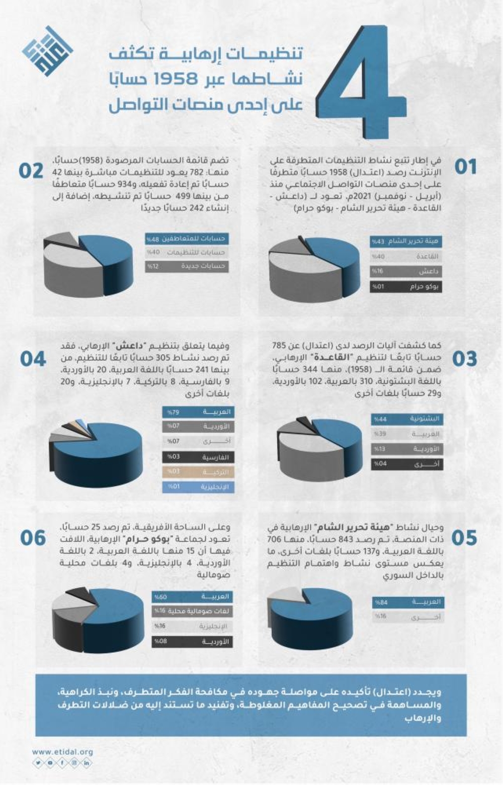 كما، كشف اعتدال، عن وجود 843 حسابا تابعا لـ"هيئة تحرير الشام" الإرهابية، ضمن قائمة الـحسابات التي تم رصدها، منها 706 حسابًا باللغة العربية، و137 حسابًا بلغات أخرى، وهو ما يعكس مستوى اهتمام التنظيم بالداخل السوري.