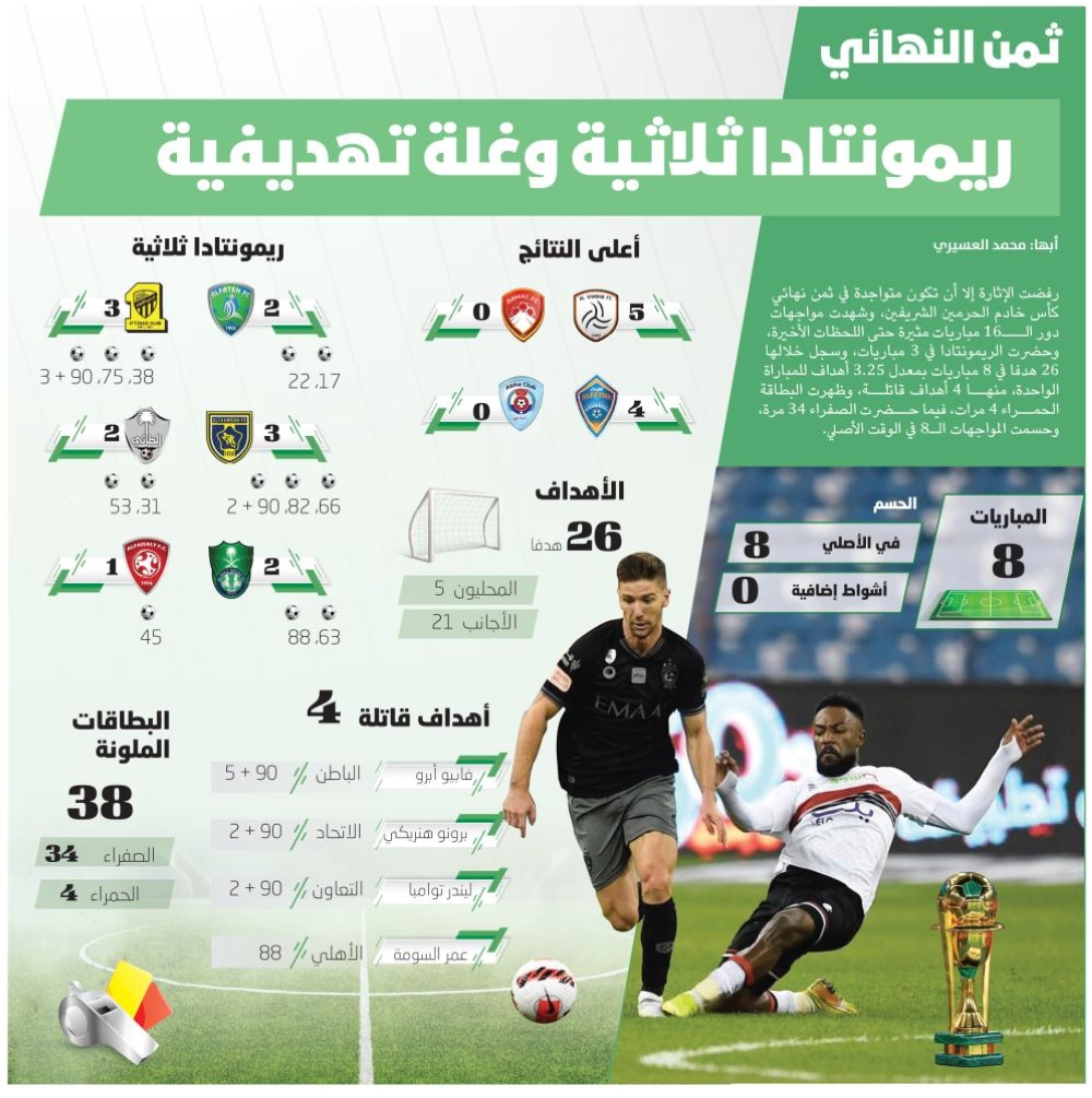 رفضت الإثارة إلا أن تكون متواجدة في ثمن نهائي كأس خادم الحرمين الشريفين، وشهدت مواجهات دور الـ16 مباريات مثيرة حتى اللحظات الأخيرة، وحضرت الريمونتادا في 3 مباريات، وسجل خلالها 26 هدفا في 8 مباريات بمعدل 3.25 أهداف للمباراة الواحدة، منها 4 أهداف قاتلة، وظهرت البطاقة الحمراء 4 مرات، فيما حضرت الصفراء 34 مرة، وحسمت المواجهات الـ8 في الوقت الأصلي.