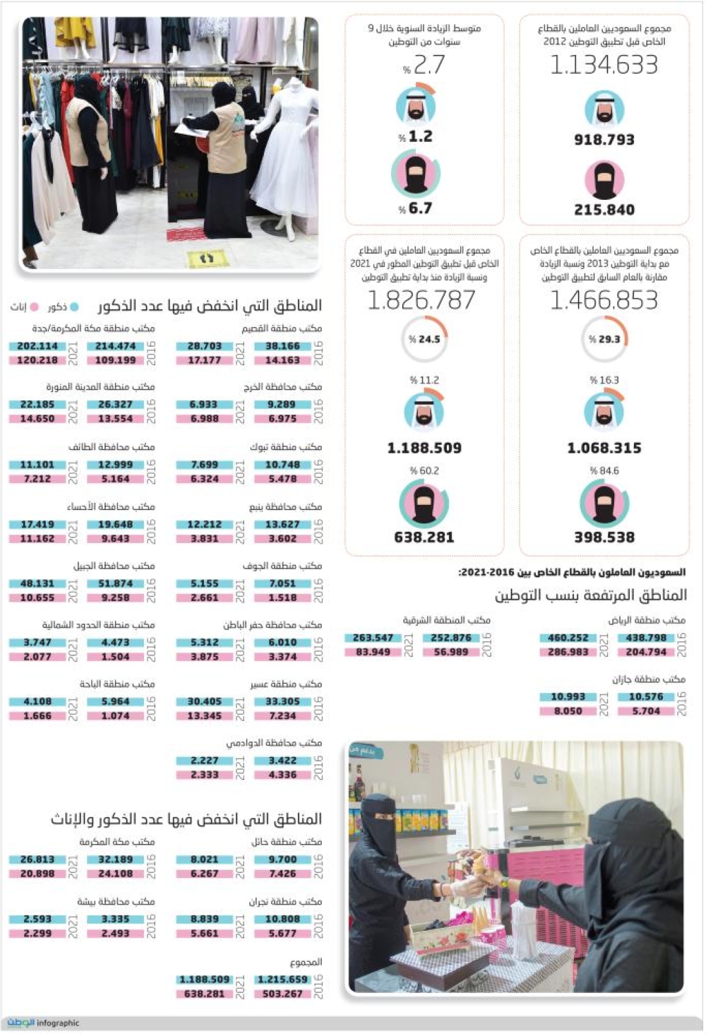 كما أظهرت البيانات أن أغلب المناطق شهدت انخفاضًا في نسبة الموظفين السعوديين الذكور في القطاع الخاص، حيث انخفضت نسبتهم في مكتب القصيم 24.8 % من 38.166 إلى 28.703 بمقابل ارتفاع نسبة الإناث 21.1 % من 14.163 إلى 17.177، وفي الخرج انخفض عدد الذكور 25.4 % من 9.289 إلى 6.933 بمقابل ارتقاع ضئيل بنسبة الإناث بلغ 0.2 % مرتفعًا من 6.975 إلى 6.988، في حين انخفض الذكور في جدة بنسبة 5.8 % من 214.474 إلى 202.114 بمقابل ارتفاع الإناث 10.1 % من 109.199 إلى 120.218، وفي المدينة المنورة انخفضت نسبة الذكور 15.7 % من 26.327 إلى 22.185 وارتفع الإناث 8.1 % من 13.554 إلى 14.650، وفي تبوك انخفض الذكور 28.8 % من 10.748 إلى 7.699، بمقابل ارتفاع الإناث 15.4% من 5.478 إلى 6.324، وفي الطائف انخفض الذكور 14.6 % من 12.999 إلى 11.101، وارتفع الإناث 39.7 % من 5.164 إلى 7.212، وفي ينبع انخفض الذكور 10.4 % من 13.627 إلى 12.212، وارتفع الإناث 6.3 % من 3.602 إلى 3.831، وفي الأحساء انخفض الذكور 11.3 % من 19.648 إلى 17.419 وارتفع الإناث 15.7 % من 9.643 إلى 11.162، أما في منطقة الجوف فانخفض الذكور بنسبة 26.9 % من 7.051 إلى 5.155، وارتفع الإناث 75.3 % من 1.518 إلى 2.661، وفي الجبيل انخفض الذكور 7.2 % من 51.874 إلى 48.131 وارتفع الإناث 15.1% من 9.258 إلى 10.655، وفي حفر الباطن انخفض الذكور 11.6 % من 6.010 إلى 5.312 وارتفع الإناث 14.8 % من 3.374 إلى 3.875، والحدود الشمالية انخفض عدد الذكور 16.2 % من 4.473 إلى 3.747، وارتفع الإناث بنسبة 38.1 % من 1.504 إلى 2.077، وفي عسير انخفض الذكور 8.7 % من 33.305 إلى 30.405 بمقابل ارتقاع الإناث 84.5 % من 7.234 إلى 13.345، وفي الباحة انخفض الذكور 31.1 % من 5.964 إلى 4.108، وارتفع الإناث 55.1% من 1.074 إلى 1.666