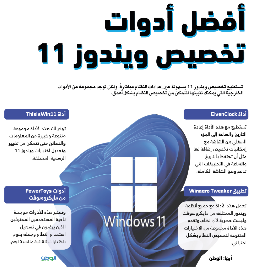 تستطيع تخصيص ويندوز 11 بسهولة عبر إعدادات النظام مباشرةً. ولكن توجد مجموعة من الأدوات الخارجية التي يمكنك تثبيتها لتتمكن من تخصيص النظام بشكل أعمق. أداة ElvenClock تستطيع مع هذه الأداة إعادة التاريخ والساعة إلى الجزء السفلي من الشاشة مع إمكانيات تخصيص إضافة لها مثل أن تحتفظ بالتاريخ والساعة في التطبيقات التي تدعم وضع الشاشة الكاملة. تطبيق Winaero Tweaker تعمل هذه الأداة مع جميع أنظمة ويندوز المختلفة من مايكروسوفت وليست حصرية لأي نظام، وتقدم هذه الأداة مجموعة من الاختيارات المتنوعة لتخصيص النظام بشكل احترافي. أداة ThisIsWin11 توفر لك هذه الأداة مجموعة متنوعة وكبيرة من المعلومات والنصائح حتى تتمكن من تغيير وتعديل اختيارات ويندوز 11 الرسمية المختلفة. أدوات PowerToys من مايكروسوفت وتعتبر هذه الأدوات موجهة ناحية المستخدمين المحترفين الذين يرغبون في تسهيل استخدام النظام وجعله يقوم باختيارات تلقائية مناسبة لهم.