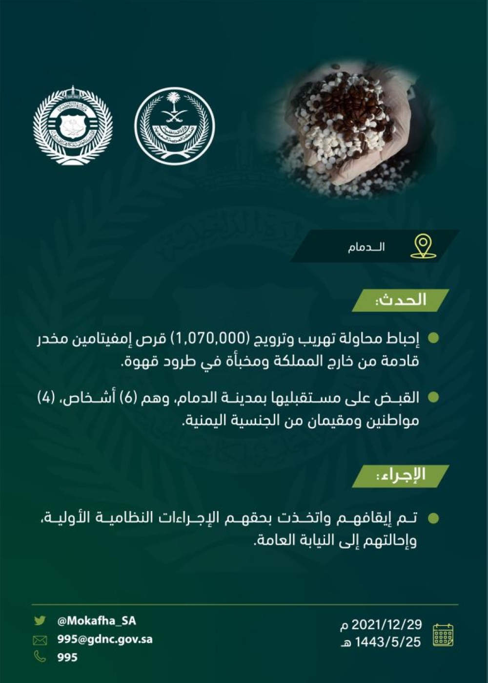 صرح المتحدث الرسمي للمديرية العامة لمكافحة المخدرات الرائد محمد النجيدي، بأن المتابعة الأمنية لشبكات تهريب وترويج المخدرات التي تستهدف أمن المملكة وشبابها، أسفرت عن إحباط محاولة تهريب وترويج (1,070,000) قرص إمفيتامين مخدر، جرى تهريبها إلى المملكة مخبأة في طرود قهوة، وذلك بالتنسيق مع هيئة الزكاة والضريبة والجمارك، والقبض على مستقبليها بمدينة الدمام، وهم (6) أشخاص، (4) مواطنين ومقيمان من الجنسية اليمنية، وجرى إيقافهم واتخذت بحقهم الإجراءات النظامية الأولية، وإحالتهم إلى النيابة العامة.