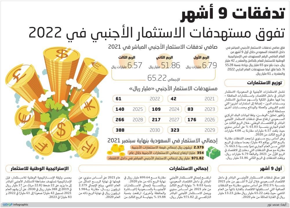 ارتفع إجمالي الاستثمار الأجنبي المباشر في داخل الاقتصاد السعودي، بنسبة 8.03% بنهاية الربع الثالث من عام 2021 على أساس سنوي ووصل الاستثمار الأجنبي المباشر التراكمي إلى 971.82 مليار ريال، مقارنة مع 899.64 مليار ريال في نهاية الربع ذاته من عام 2020.