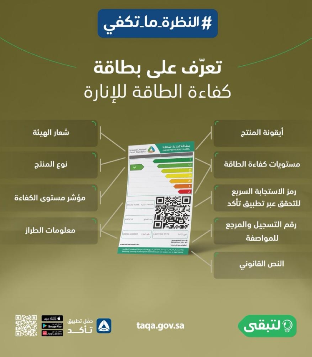 حيث أوضح المركز أن الفرق بين مصابيح الإنارة من نوع (LED)، والتي تكون في المستوى الأخضر بإمكانها توفير ما يصل إلى 78% توفير في استهلاك الطاقة مقارنة بالمصابيح من نوع (Incandescent) غير الموفرة. واشتملت المقارنة على أن المصابيح الموفرة عمرها الافتراضي يصل إلى 20.000 ساعة بقدرة (6W)، بينما المصابيح العادية فعمرها الافتراضي يصل 1500 ساعة فقط، وتستهلك (60W).