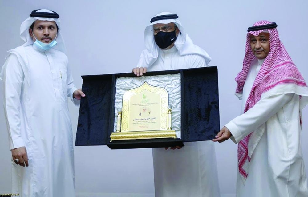 كرم أمين العاصمة المقدسة محمد القويحص، رجل الأعمال خالد بن عوض اللحياني من شركاء النجاح لفرع هيئة الصحفيين السعوديين بمكة المكرمة، خلال رعايته حفل الفرع لتكريم الفائزين بمسابقة ذكرى البيعة السابعة لخادم الحرمين، وتدشين الصالون الإعلامي بقاعة G2 بالغرفة التجارية الصناعية بمكة المكرمة، بحضور مدير فرع الهيئة وعدد من المسؤولين والإعلاميين.